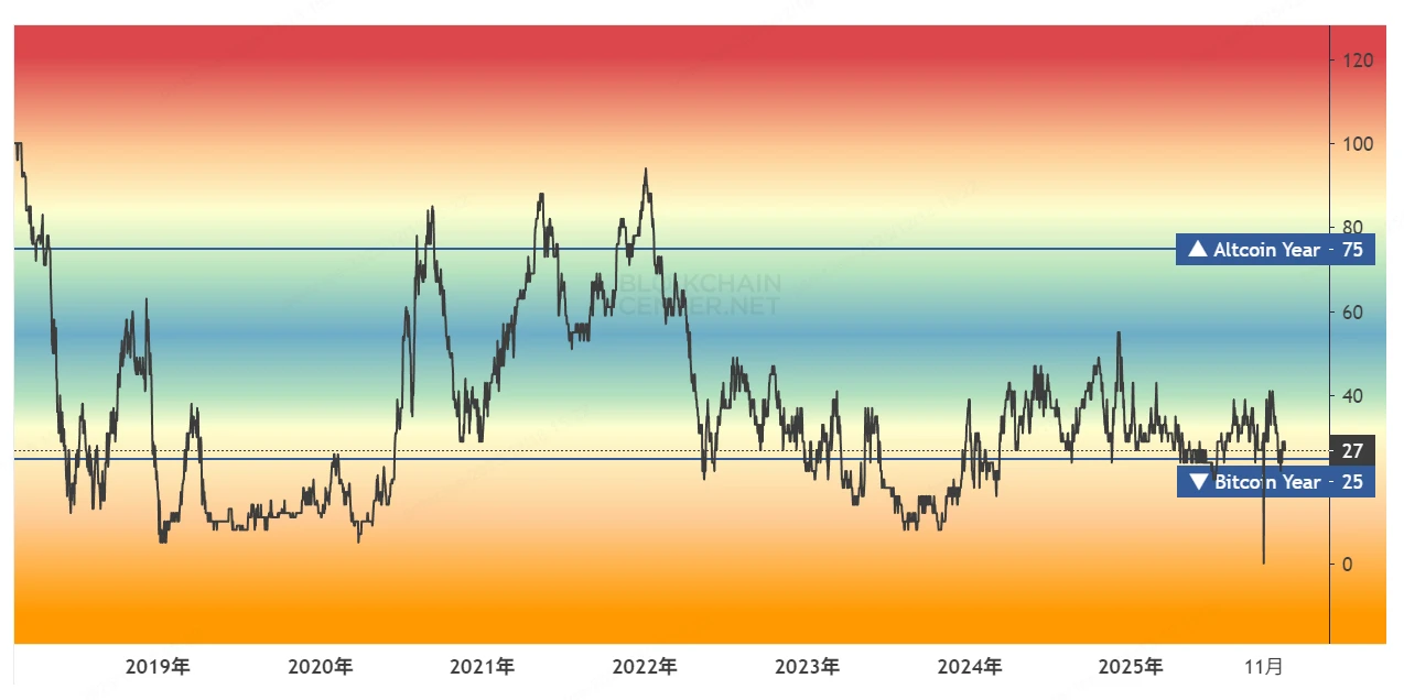 而当前(2025 年 Q4),指数处于 30~40 区间,山寨板块表现低迷。其实本轮 BTC 牛市以来,该指标最高都没有触及 60,这可能是因为流动性不足以及过多增发的新币造成的。