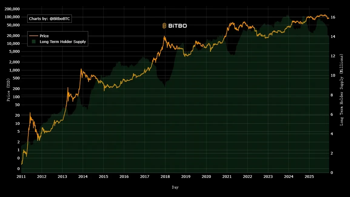 Bitcoin Long Term Holder Supply (LTH) 追踪持有超过 155 天的比特币供应量,反映 HODLer 行为。