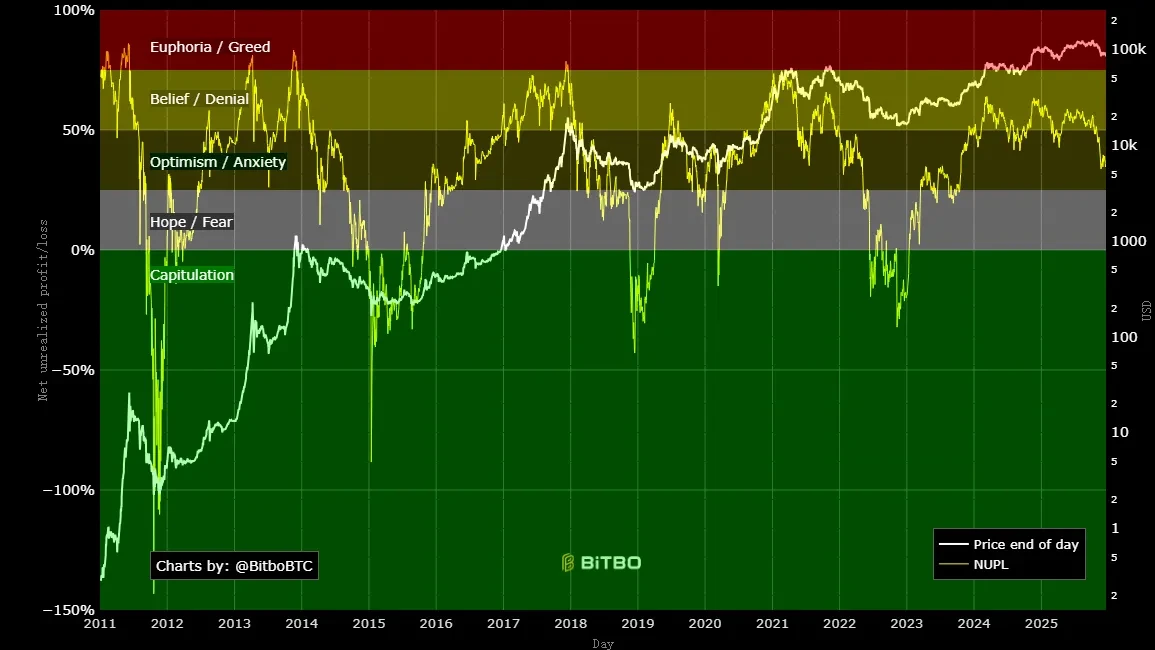 Bitcoin NUPL 衡量网络整体未实现盈亏比率,评估市场情绪。