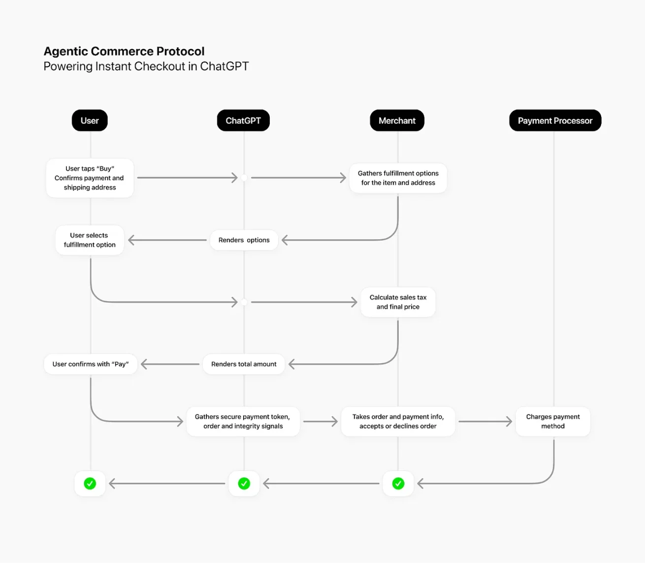 这是目前代理处理资金最直接的方式:用户全程控制。用户下单后,ChatGPT 通过 ACP 将必要信息发送给商家后端。商家随后决定接受或拒绝订单,通过原有支付服务商处理款项,并像往常一样处理发货和客服。