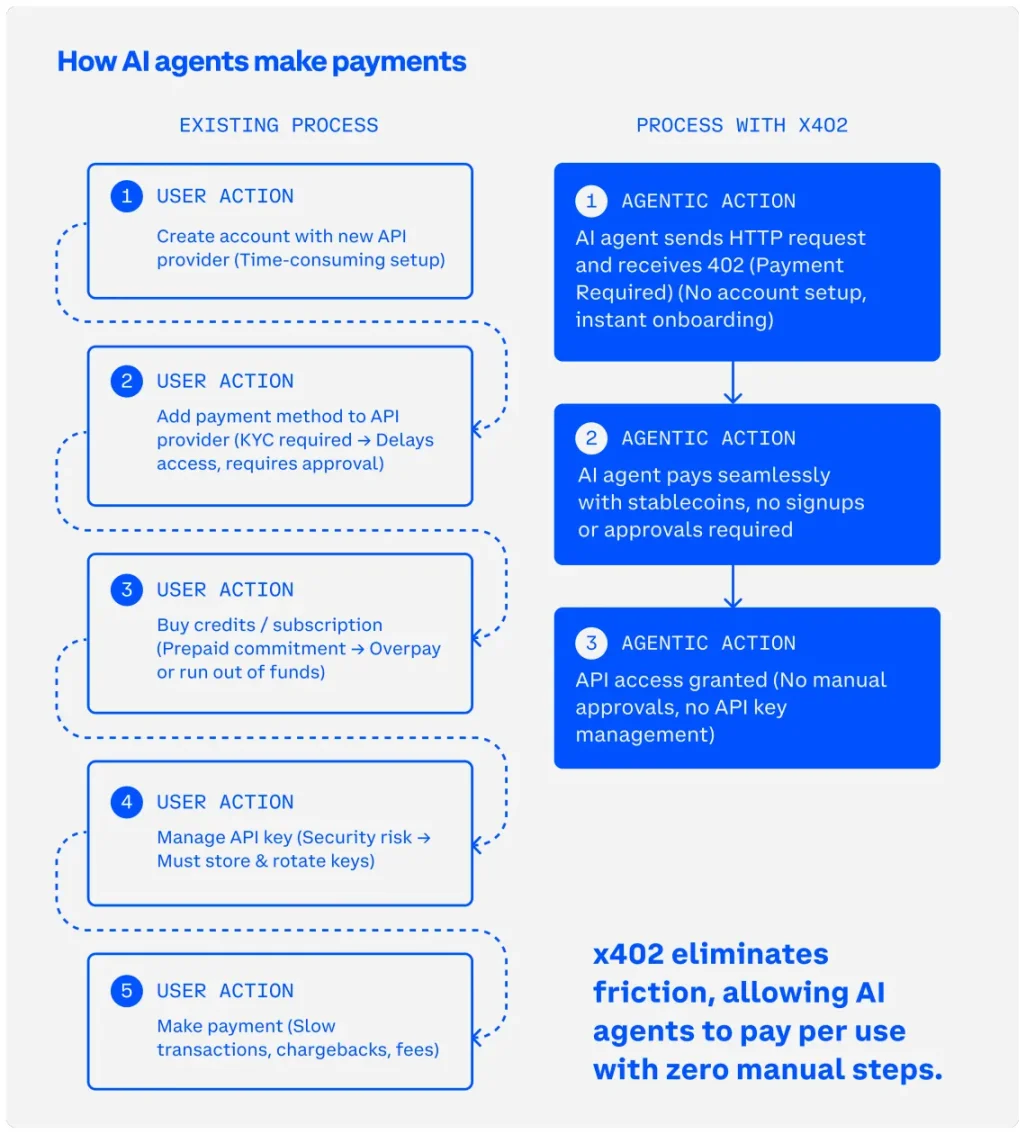 借助 x402,代理可以精确支付当下所需。例如,花 2 美分看一篇付费文章,或支付几分之一美分进行一次 API 调用。交易在链上几秒内即可结算,无需建立长期关系。