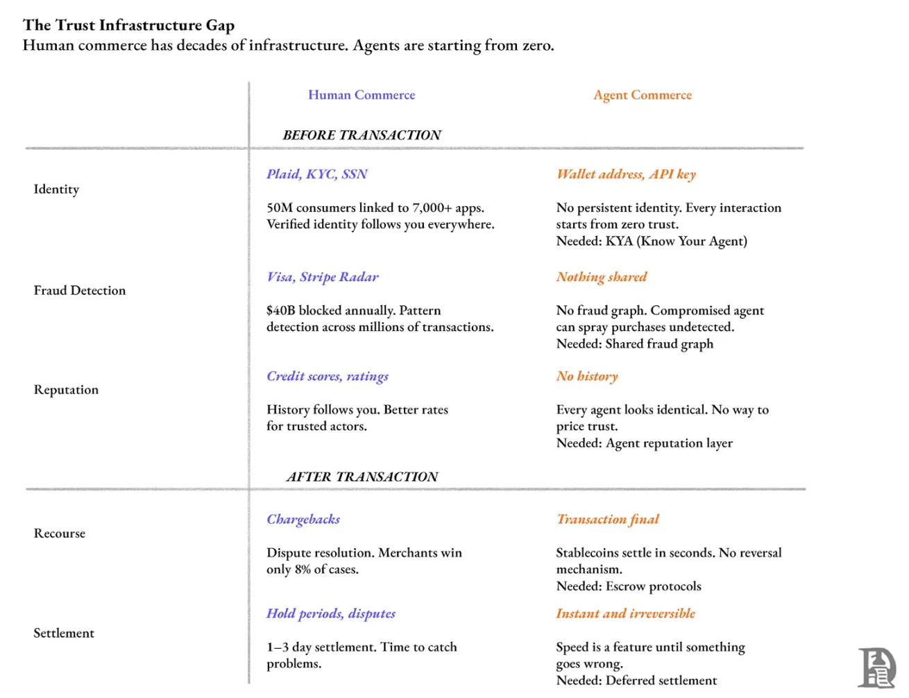 没有持久身份和信誉,每次代理互动都始于零点。信誉深深嵌入人类商业:你看到的广告基于浏览记录,Uber 评分影响司机接单,信用评分伴随你到每个金融机构。对代理而言,也应如此。