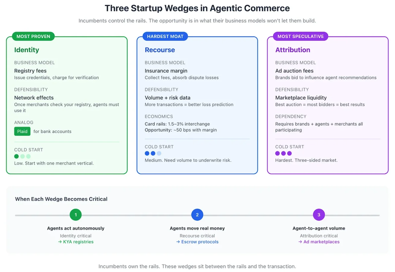 代理身份 最直接。注册模式已被验证。虽然 Plaid 是经典案例,但很贴切:他们为银行账户做了身份验证。初创公司可以为代理做同样的事:颁发凭证、积累信誉、让商户在收款前查验信誉分。其护城河来自网络效应:一旦足够多商户通过你的注册表查验,代理就不得不保持良好的信誉记录。