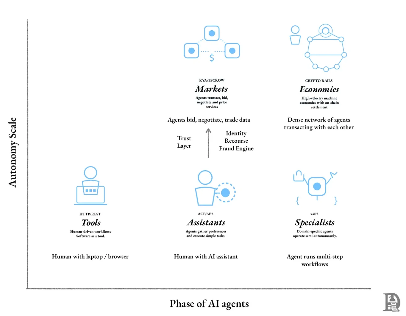 这让我们陷入了一个困境:新技术未能继承旧有基础设施的一大优点,例如在出错时撤销支付的能力。本文要探讨的正是这个问题。我们将讨论代理实现自主性需要什么,谁在为此构建基础,以及为何会有新创公司出现在区块链支付通道与自主代理的交汇处。