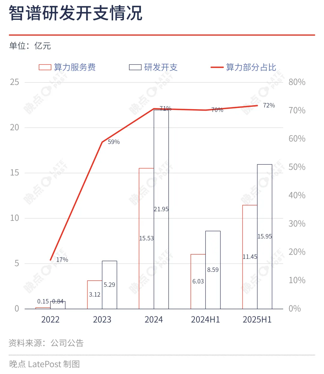 2022 年至 2024 年,以及今年上半年,智谱的经调整净亏损分别为 0.97 亿元、6.21 亿元、24.66 亿元以及 17.52 亿元,其中研发费用分别为 0.8 亿元、5.3 亿元、22.0 亿元、以及 15.9 亿元,占据绝大比例。