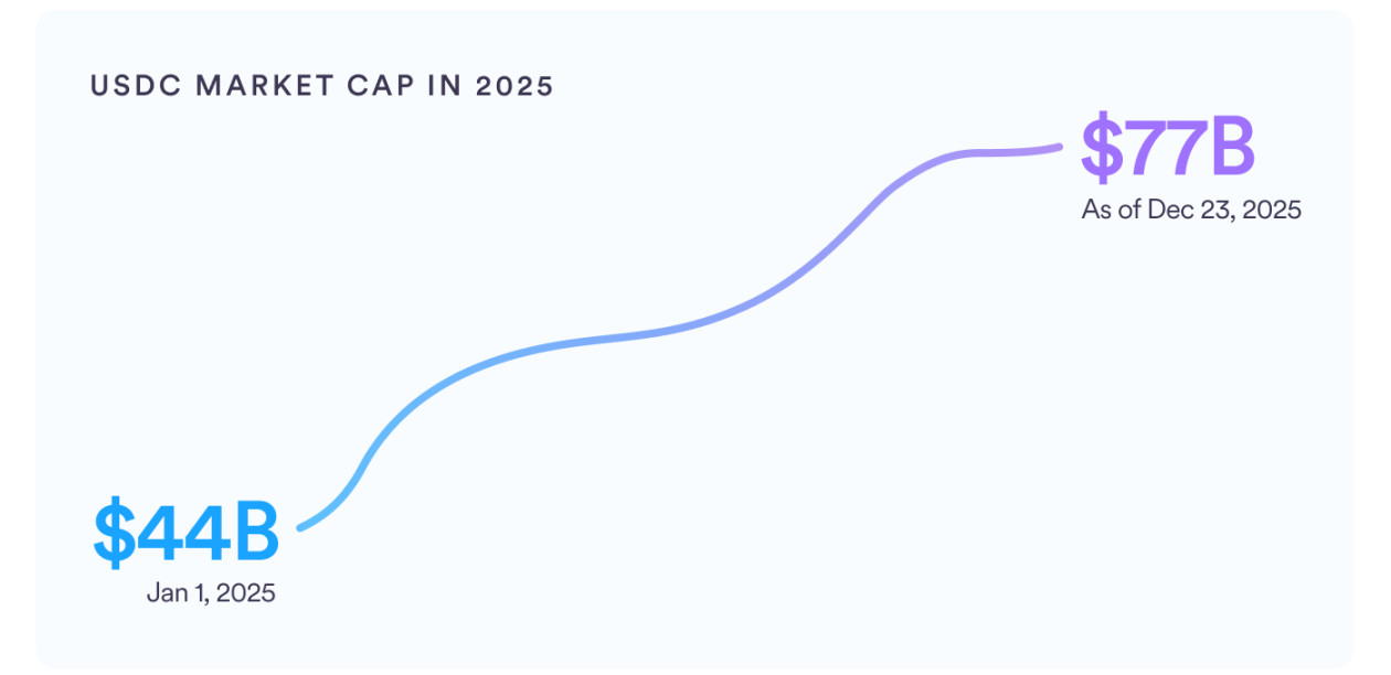 截至 2025 年 12 月 23 日,USDC 市值从 440 亿美元升至 770 亿美元,增长 75%。链上覆盖拓展至 30 条区块链,新增 XRP Ledger 等 14 条公链。CCTP 协议升级后支持 17 条链跨链转移,累计交易额超 1260 亿美元、转账超 600 万笔。