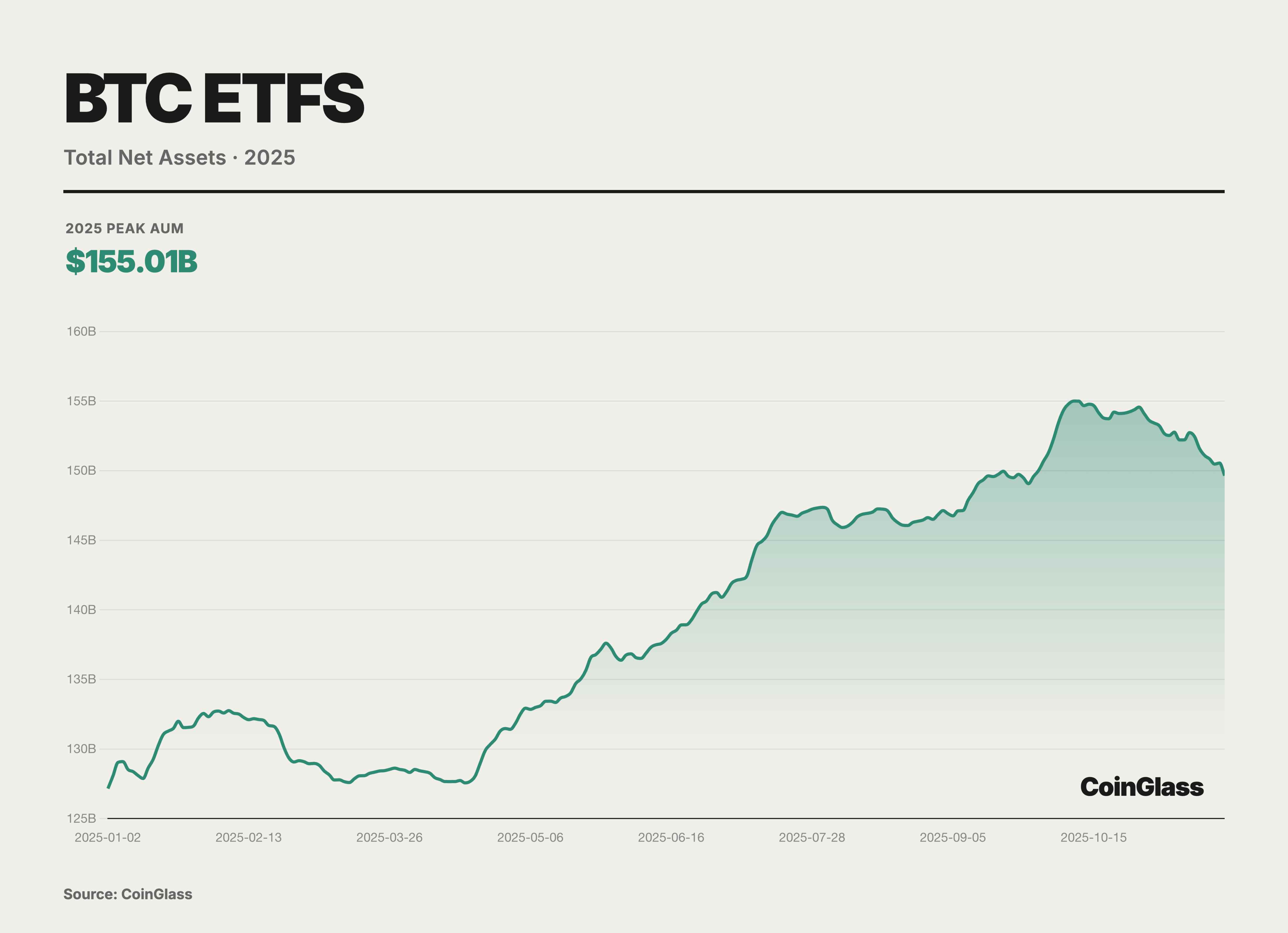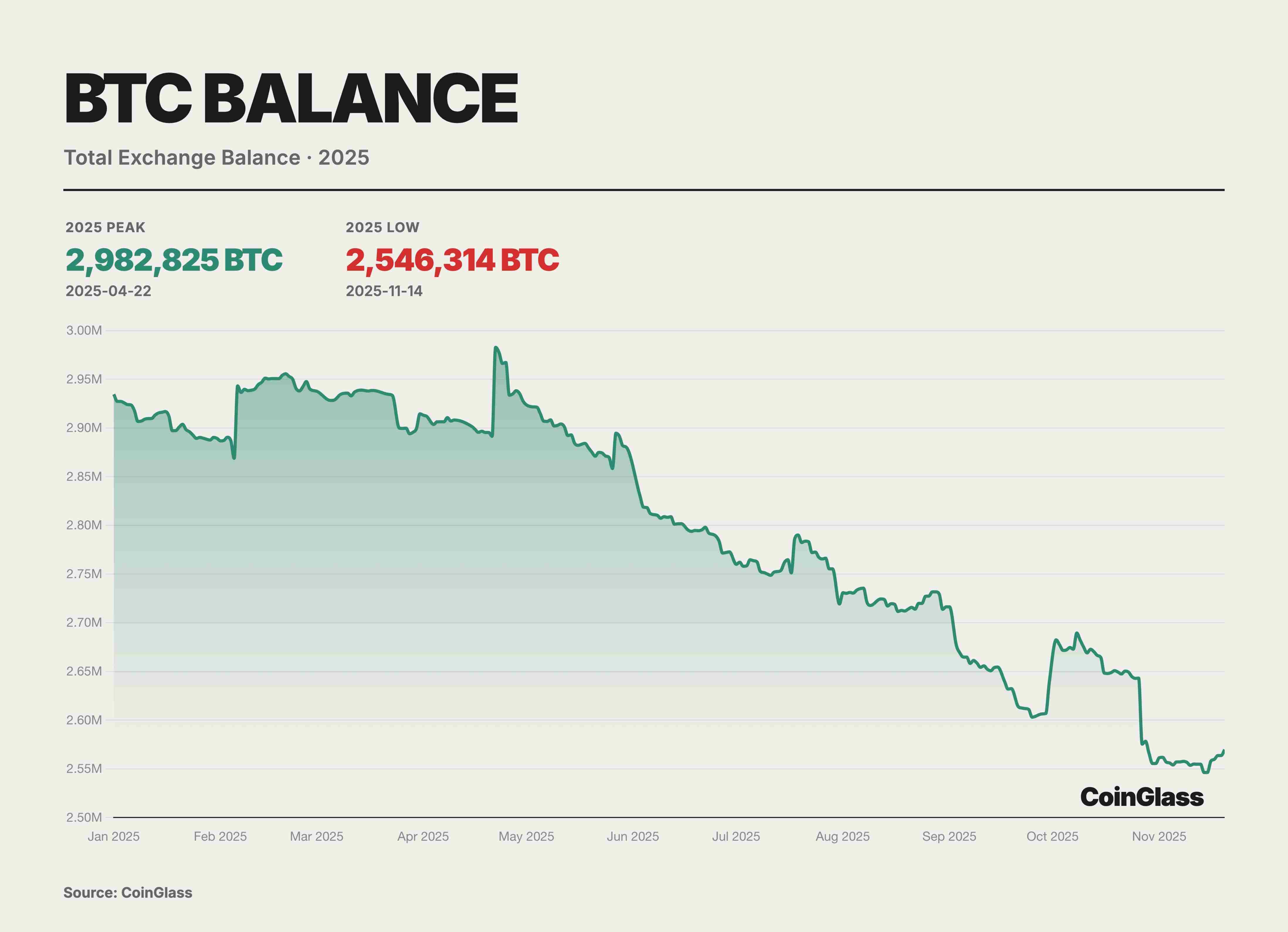 2025 年,BTC 在交易所层面的供给结构出现了明显再平衡迹象,全网交易所余额整体呈台阶式下行、从 4 月高点起进入持续去库存阶段。CoinGlass 数据显示,自 4 月 22 日附近触及约 298 万枚的年内峰值后,交易所 BTC 储备在随后数月整体呈阶梯式下行,于 11 月中旬一度下降至约 254 万枚,区间净流出约 43 万枚,降幅约 15%。