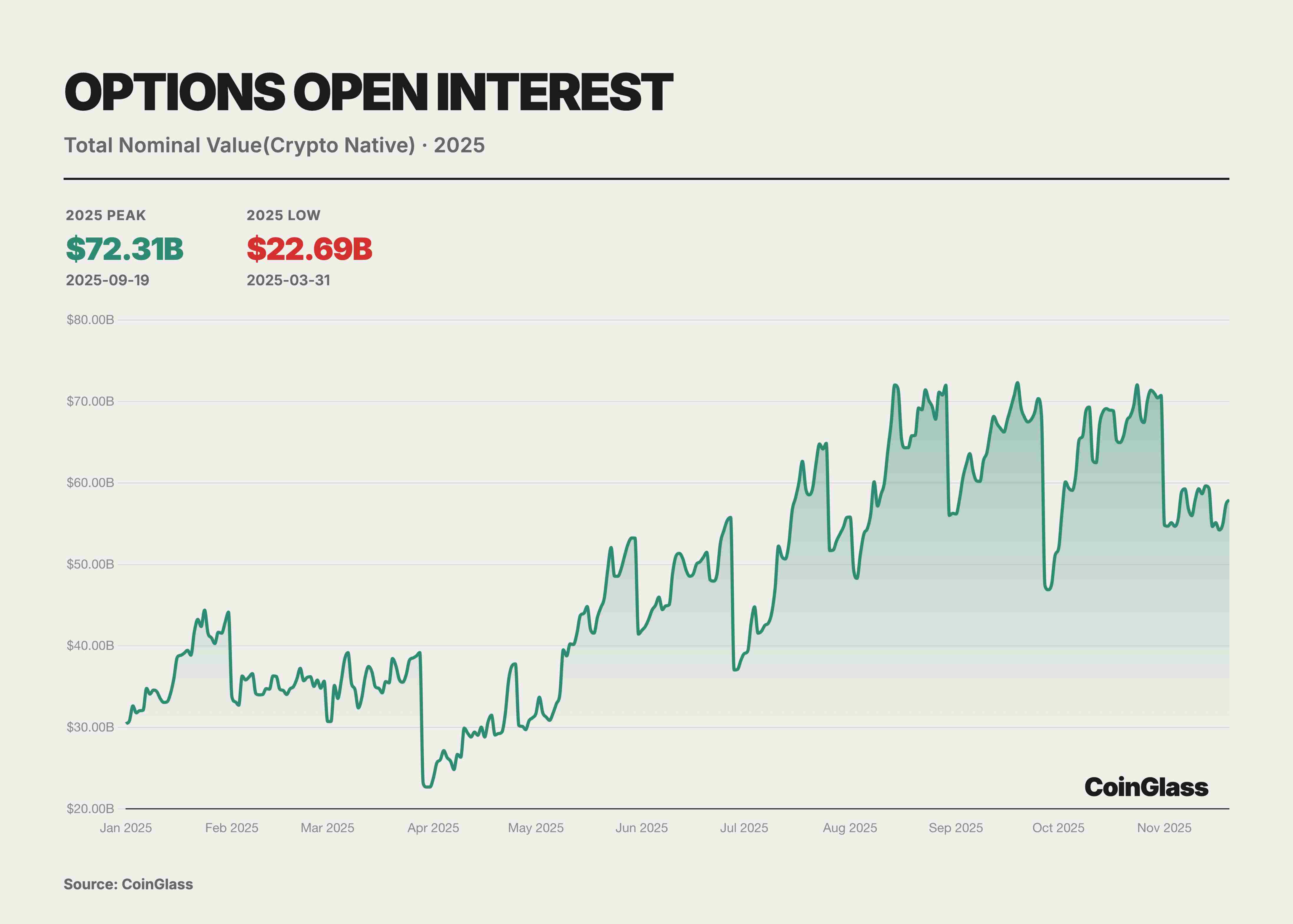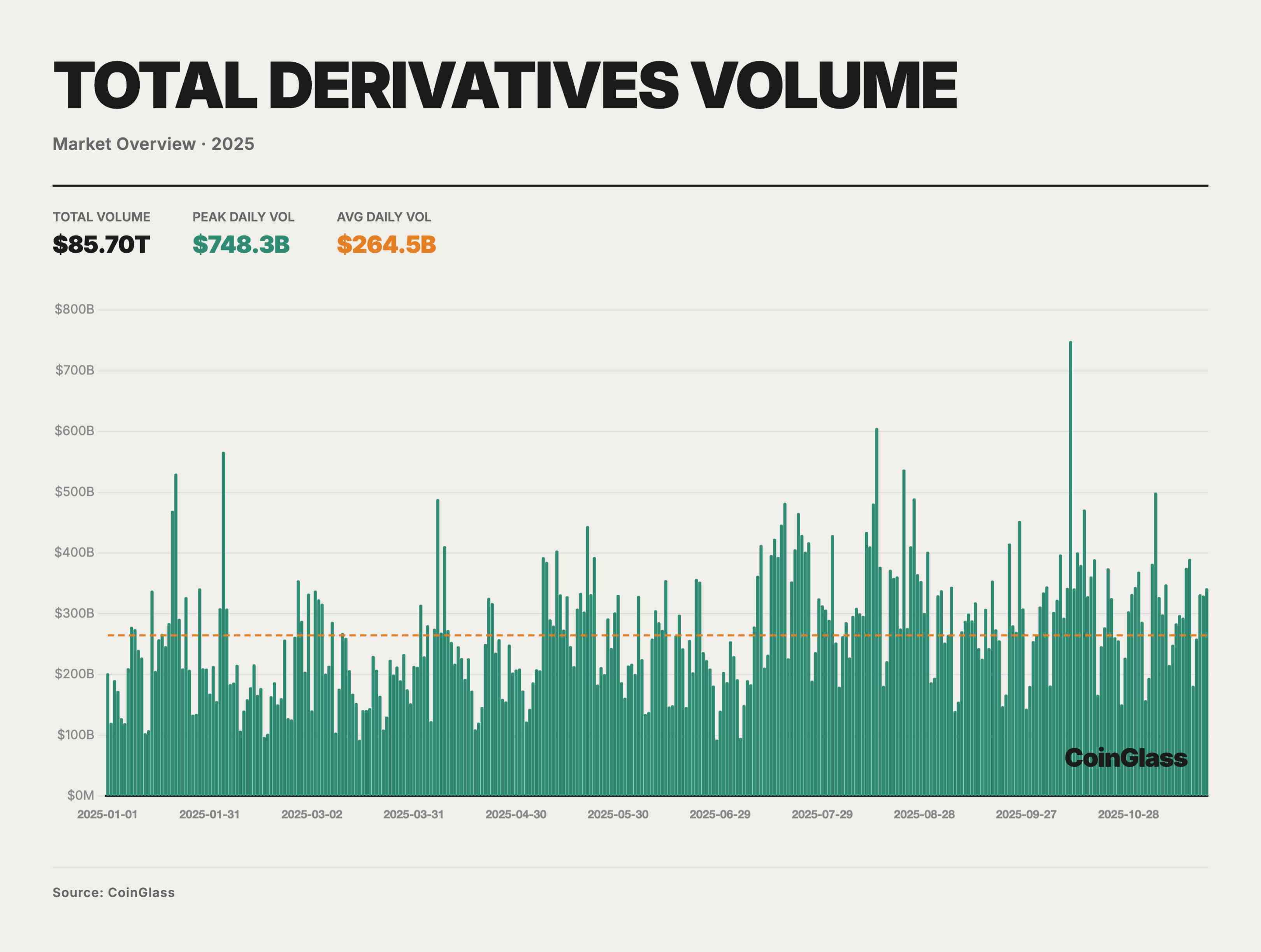 2025 年,加密衍生品市场总成交量约 85.70 万亿美元,日均成交约 2,645 亿美元。在宏观流动性环境依旧偏紧、风险偏好阶段性修复的背景下,全年成交活跃度整体呈「先低后高、震荡抬升」的结构。目前,衍生品已经成为绝大部分主流资产价格形成与风险管理的主要场所。图中橙色虚线所示的均值上方反复出现放量交易日,其中 10 月 10 日单日峰值约 7480 亿美元,显著高于年内常态水平,反映出在行情加速阶段,衍生品已成为价格发现与杠杆博弈的核心战场。月度维度看,一季度日均成交额多在 2000 亿美元,二季度起逐步走高,7–8 月及 10 月的日均水平抬升至 3000 亿美元以上。