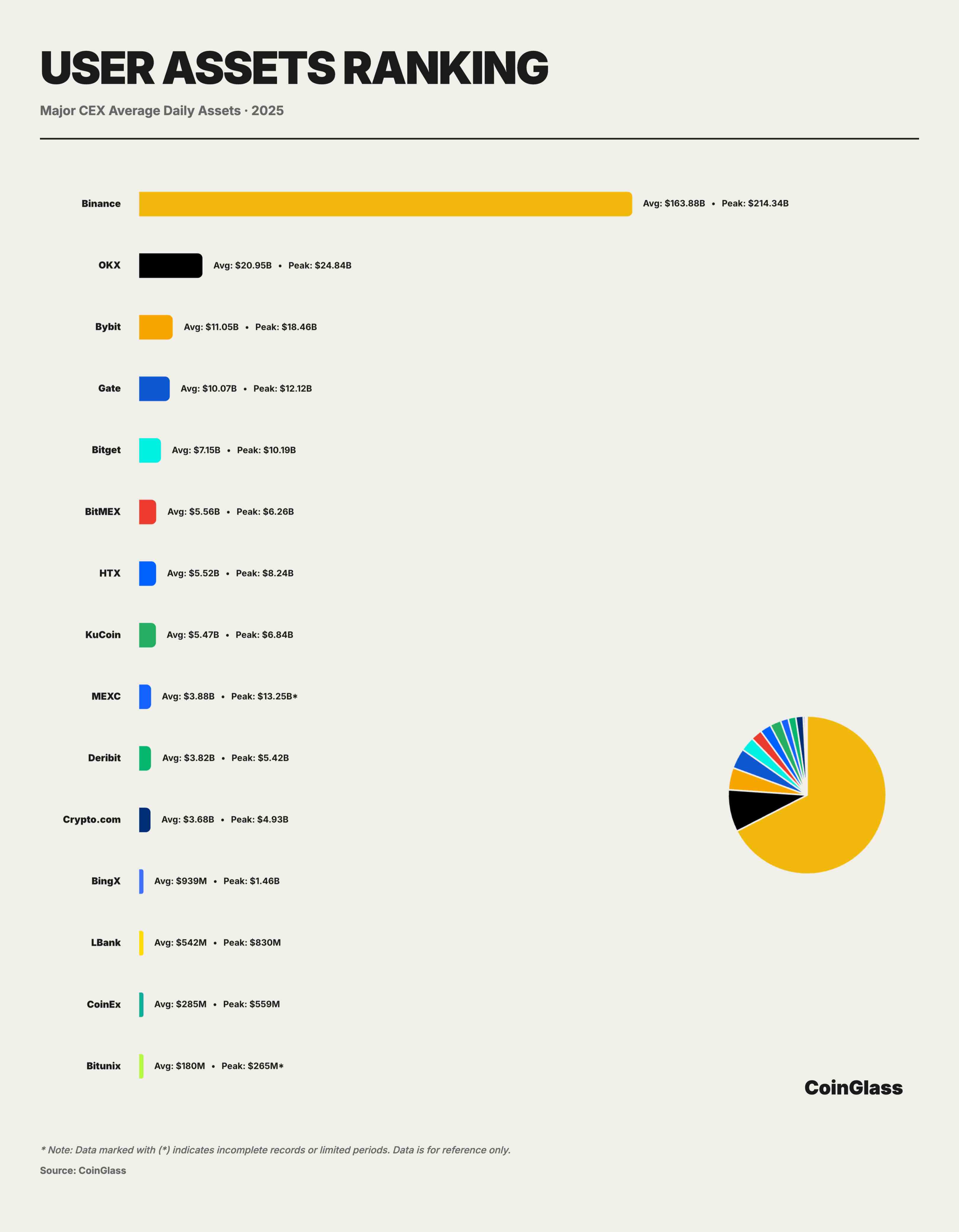 OKX 以约 210 亿美元的日均资产和 248 亿美元的峰值位居第二,规模约为第三名 Bybit 的两倍,显示出其在用户资金留存和中长期资产沉淀上的优势。但这种双极 + 多家腰部平台的结构,意味着资金托管风险在前两名平台高度集中,一旦任一平台在合规、技术或运营层面出现尾部事件,其外溢效应将远超单个平台本身的市占比。 在第二梯队之后,市场进入了竞争更为激烈的百亿级区间。Bybit、Gate 与 Bitget 分别约 110.5 亿、100.7 亿与 71.5 亿美元日均资产,共同构成次头部资产承载层。前五家平台合计吸纳了超过 90% 的用户资产,用户资金高度集中。