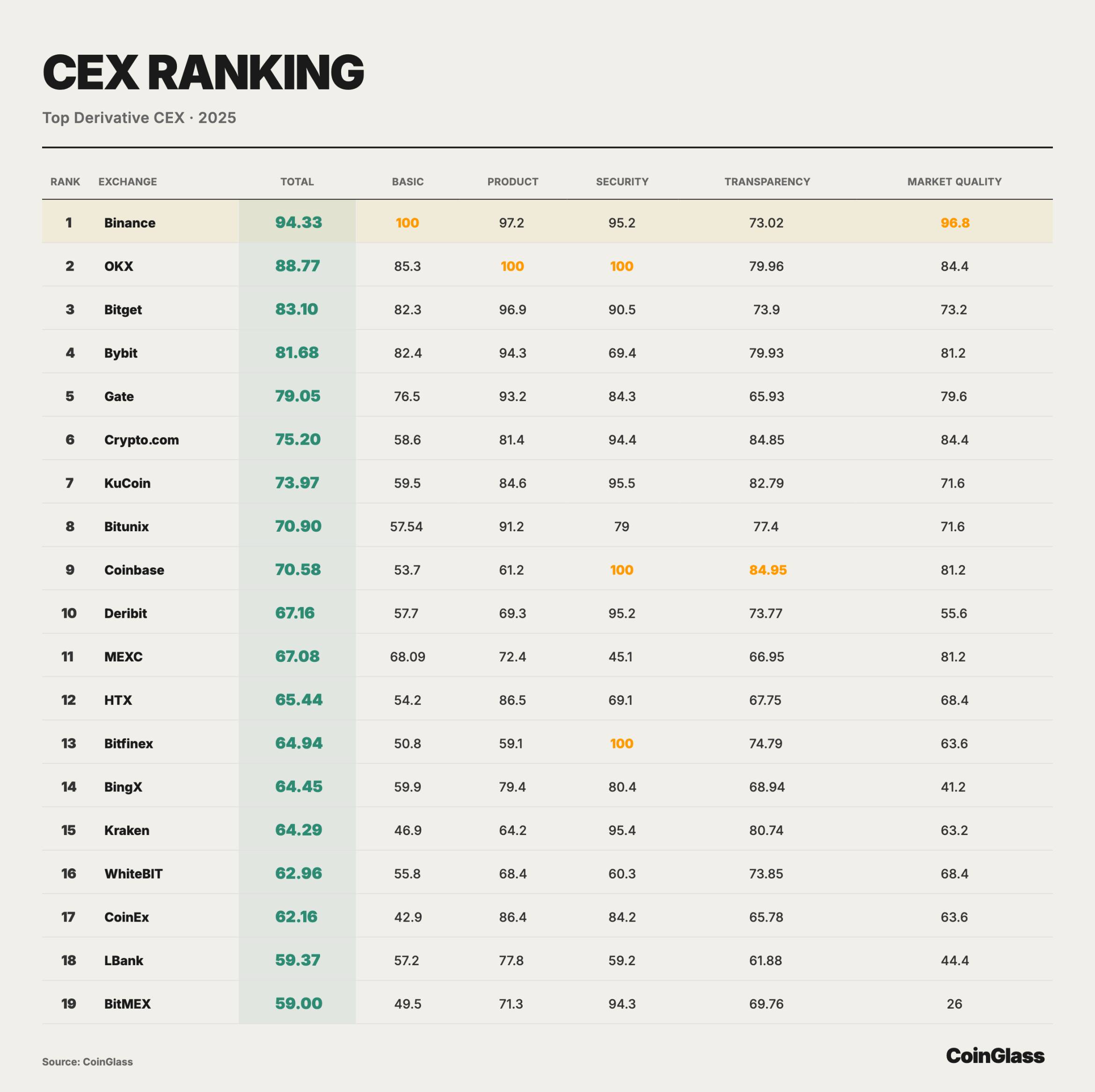 为将衍生品交易在 CEX 侧的头部集中从体量叙事进一步落到可比较的质量维度, CoinGlass 对主要衍生品 CEX 进行了综合评分与排序。下图以基础交易数据为核心权重,并从产品、安全、透明度与市场质量等维度给出分项得分与加权总分,从而直观呈现不同平台在流动性承载、风控约束与信息披露上的结构性差距。