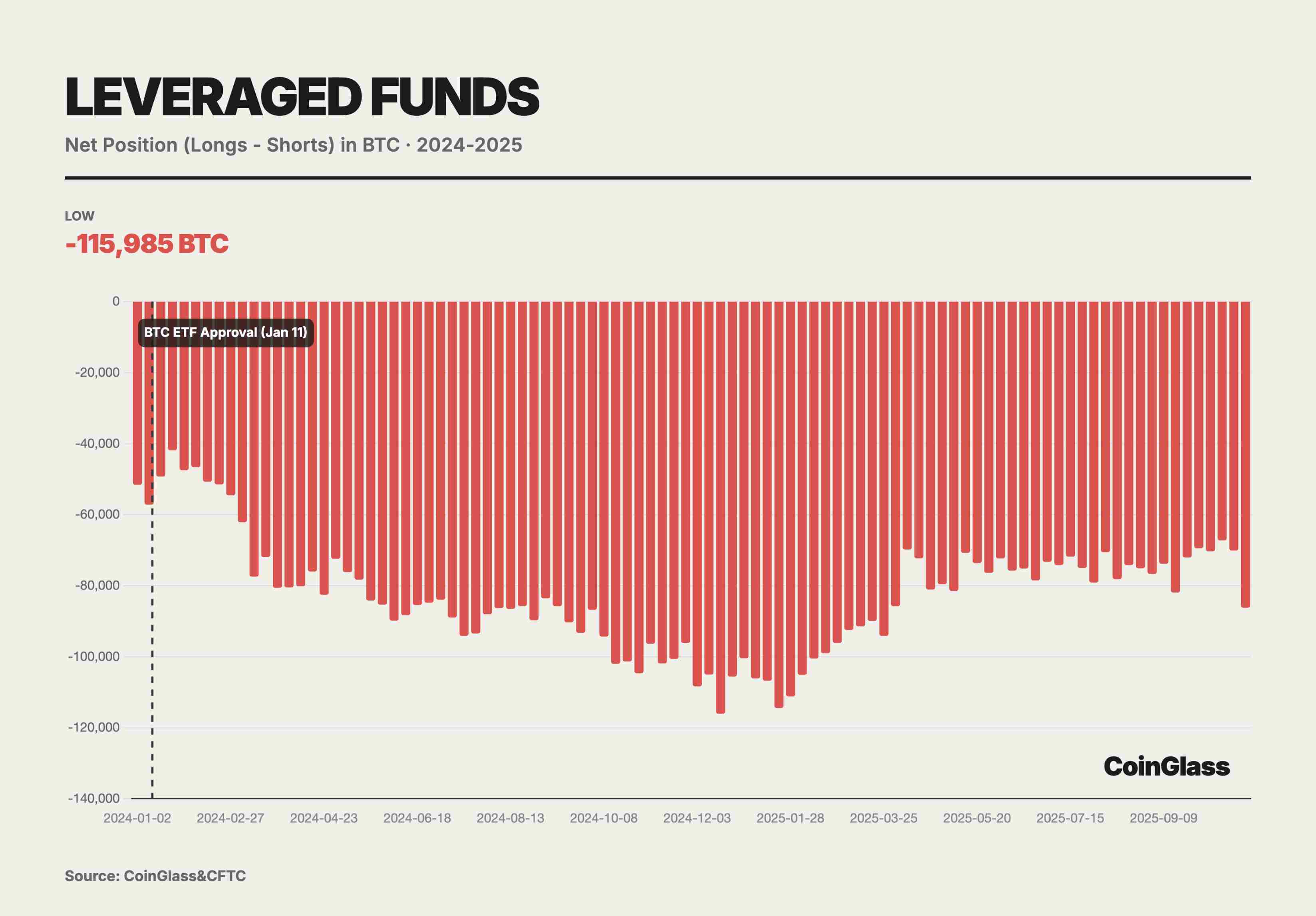 目前杠杆基金持有的净空头头寸高达 1.4 万张合约。深入分析表明,这实际上是基差交易(Basis Trade)的直接产物。杠杆基金在现货市场或通过 ETF 买入 BTC,同时在 CME 卖出等量的期货合约。这一组合是 Delta 中性的,其目的是为了赚取期货价格高于现货价格的基差收益。随着现货 ETF 资金流入的增加,杠杆基金的空头头寸反而同步增加 。这证明了空头头寸并非方向性做空,而是为了对冲现货 ETF 带来的多头库存。杠杆基金最高峰时持有 115985 枚 BTC 的净空单,实际上,杠杆基金是现货 ETF 流动性的主要提供者和搬运工。