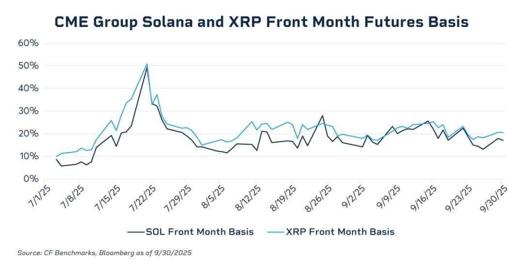 长期以来,CME 仅是 BTC 和 ETH 的双寡头市场。然而,2025 年这一格局被打破。随着 SOL 和 XRP 期货及期权的推出,CME 正式进入了多资产时代。SOL 作为第三大资产的有力竞争者,SOL 期货自 3 月推出以来表现抢眼。截至 Q3,累计交易量达到 73 万张,名义价值 340 亿美元。更重要的是,SOL 期货的 OI 在 9 月份迅速突破 21 亿美元,创下了新合约持仓量翻倍速度的最快记录。同时,XRP 期货自 5 月推出以来交易了 47.6 万张合约。10 月 13 日推出的 XRP 期权更是成为了市场上首个受 CFTC 监管的此类产品。它标志着机构投资者不再将加密货币等同于 BTC。对于 SOL 和 XRP 这类具有不同风险收益特征的资产,机构开始寻求合规的对冲渠道,这预示着未来多策略加密对冲基金将在 CME 上更加活跃。