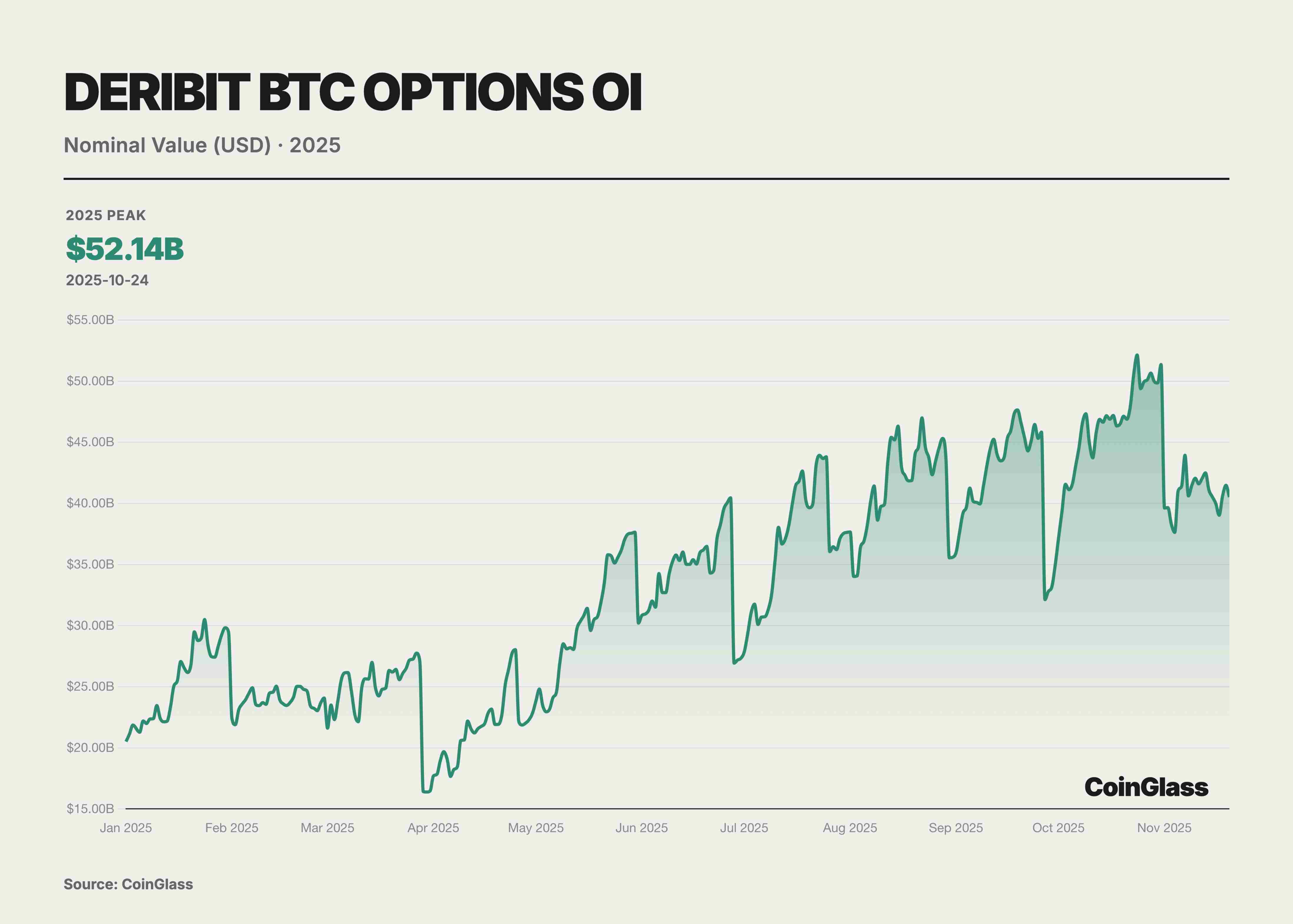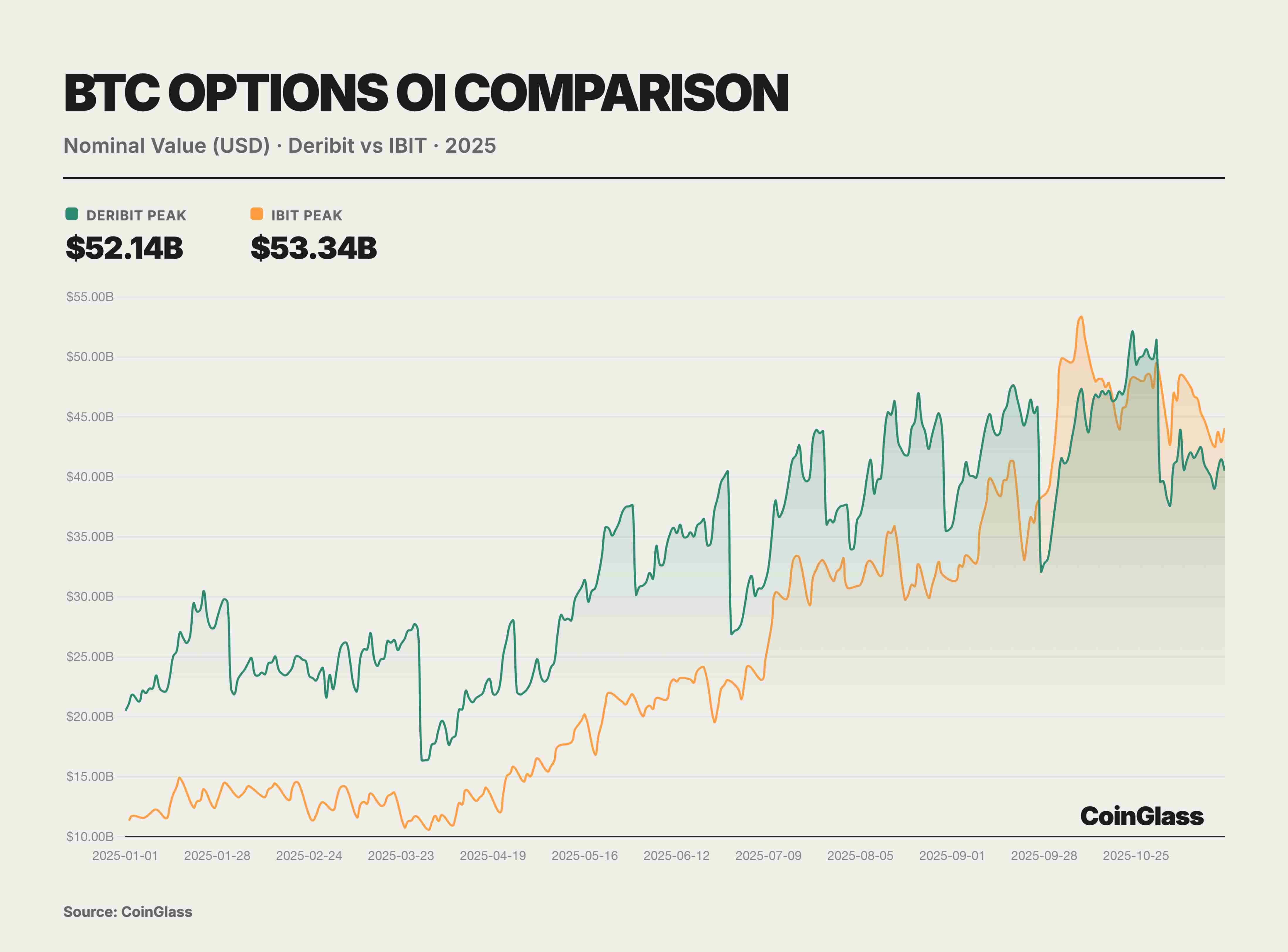 本年度期权市场的核心叙事由两大里程碑事件定义,这两大事件共同重塑了全球数字资产的定价权逻辑。首先是美国最大的合规交易所 Coinbase 以 29 亿美元完成对离岸期权巨头 Deribit 的收购,这一并购案不仅标志着传统合规交易所对原生加密流动性的整合,也重新定义了全球衍生品交易的基础设施格局 。其次,BlackRock 旗下 IBIT ETF 期权的崛起,并在 2025 年第三季度末在持仓量上首次超越长期霸主 Deribit,标志着传统金融资本已正式在波动率定价权上与加密原生平台分庭抗礼。在此之前,Deribit 一直享有近乎垄断的优势,截至 2024 年底,Deribit 控制着约 85% 的全球加密期权市场份额。