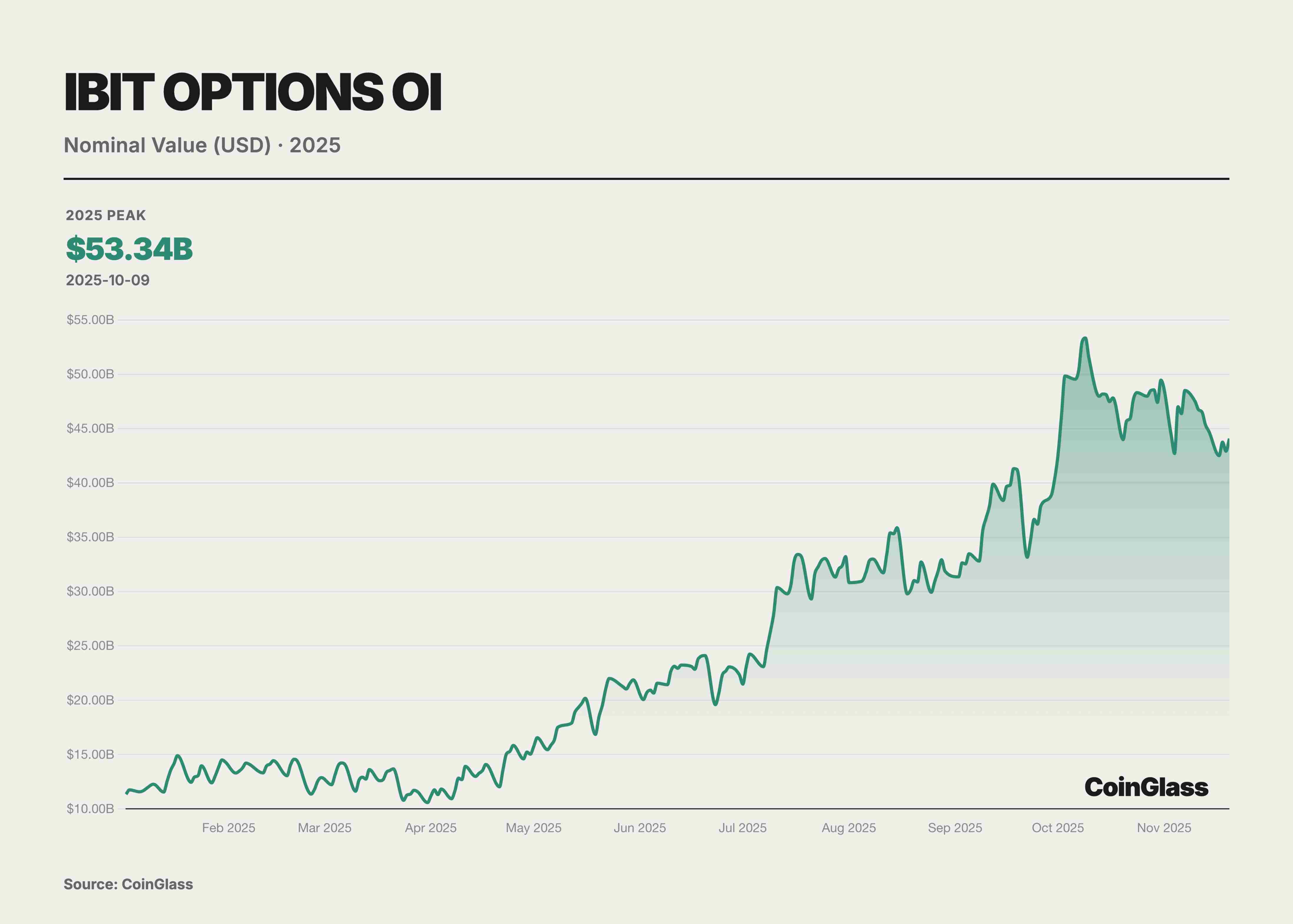 这一年中,传统金融机构的介入成为期权市场变化的分水岭。随着美国监管环境的演变,多家华尔街机构推出了 BTC ETF 及其期权产品。尤其引人注目的是贝莱德推出的 IBIT 于 2024 年 11 月开始提供期权交易,在 2025 年迅速崛起为 BTC 期权市场的新巨头。总体来看,2025 年的市场格局呈现双轨特征:一方面是以 Deribit 等为代表的 crypto-native 平台,另一方面是以 IBIT 等 ETF 期权为代表的传统金融渠道。