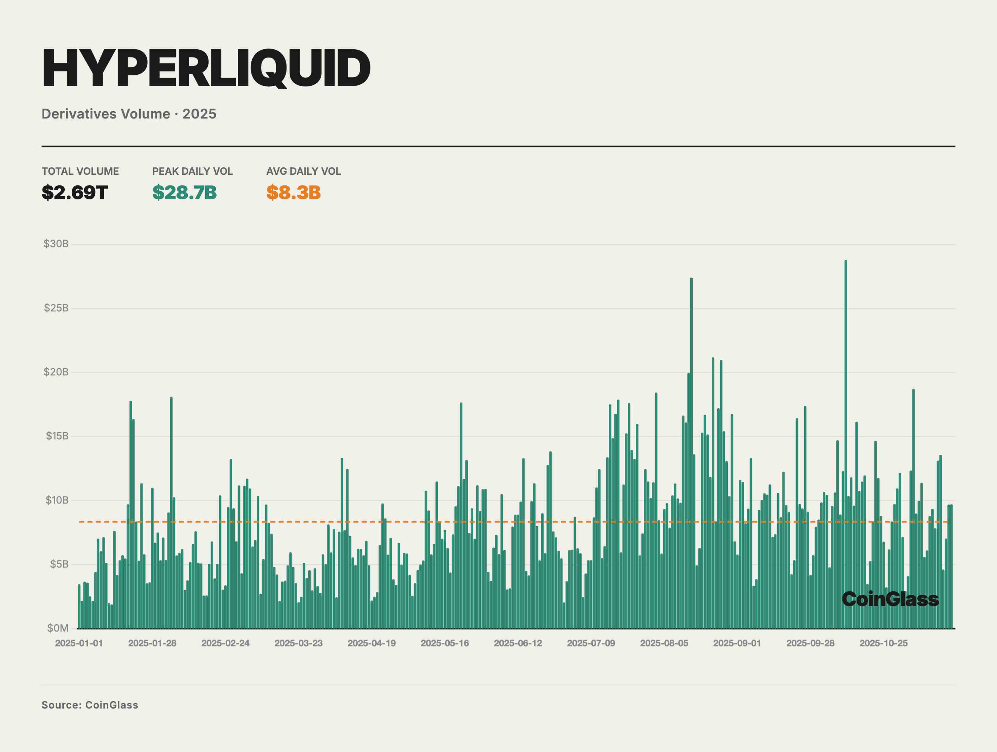 2025 年对于 PerpDEX 而言是极为辉煌的一年。整个市场交易活动爆发式增长,不断刷新历史纪录。月度交易量在 10 月份首次超过 1.2 万亿美元,累计全年链上衍生品交易量已达数万亿美元量级。交易量的激增与占比的提高背后,是性能突破、用户需求上升以及监管环境变化等多重因素共同驱动的结果。无论是散户投资者、机构交易部门还是风险投资基金,都在 2025 年将目光投向了这一蓬勃发展的赛道。