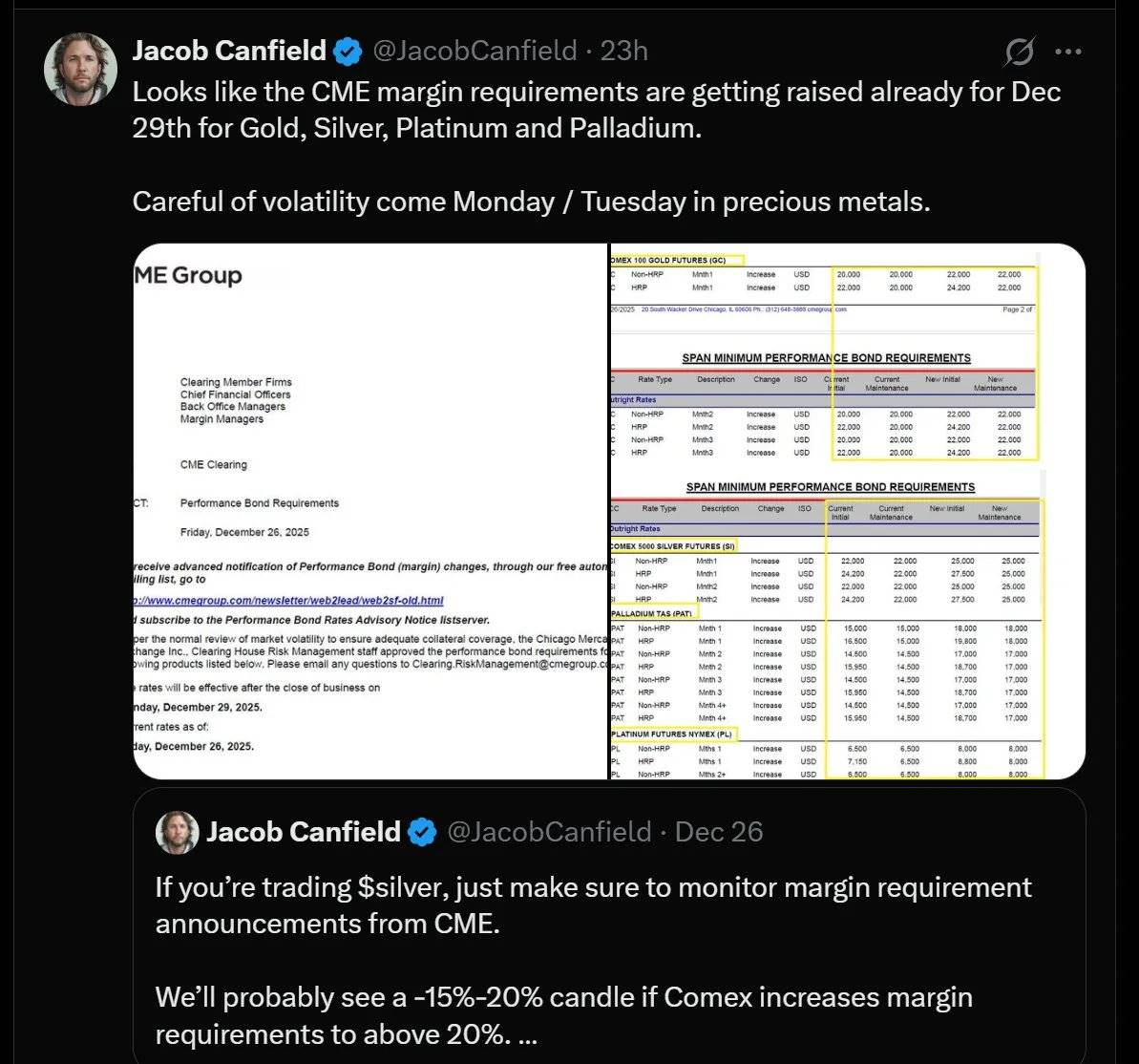 CME(芝加哥商品交易所)宣布自 12 月 29 日起上调贵金属的保证金要求。