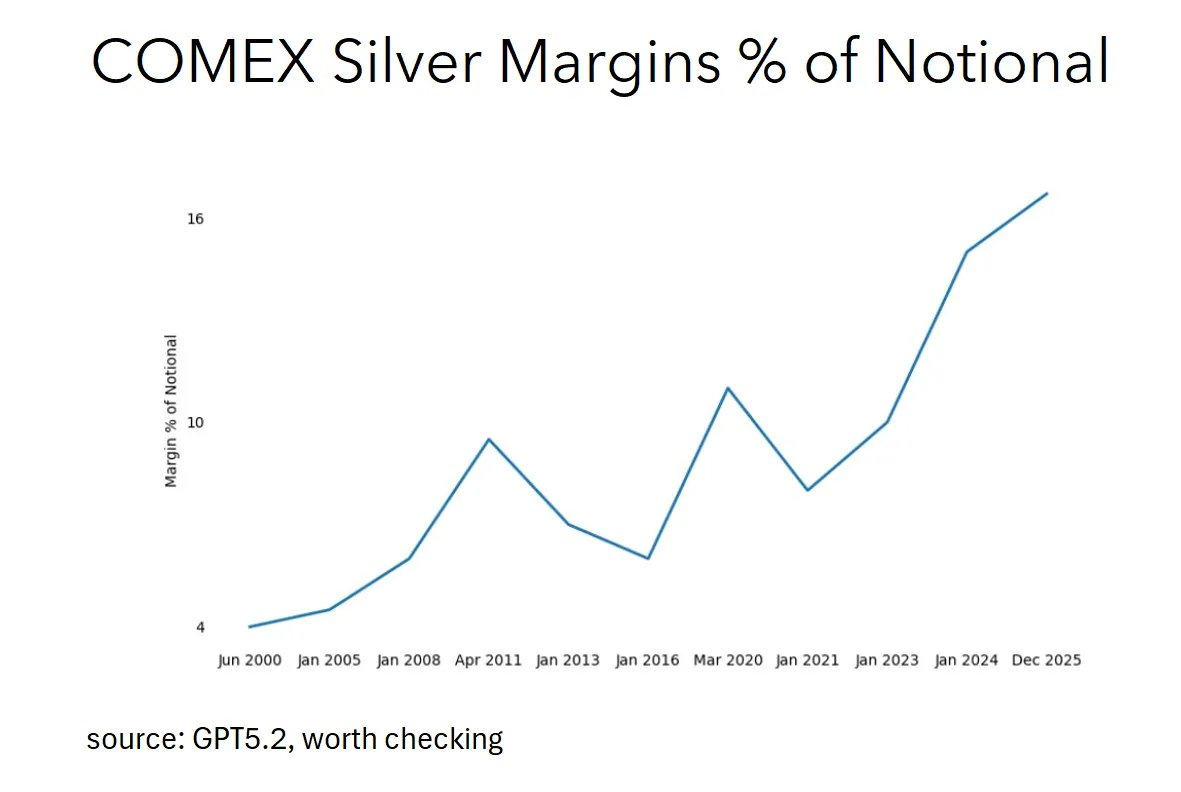 如果你在期货市场中使用了杠杆,这一变化可能会对你产生重大影响。更高的保证金要求 = 更高的资本需求 = 对资金不足的投资者造成强制平仓。这与 2011 年白银市场崩盘时的情形类似,当时 CME 在 8 天内连续五次上调保证金要求,导致杠杆率暴跌,白银的上涨行情戛然而止。