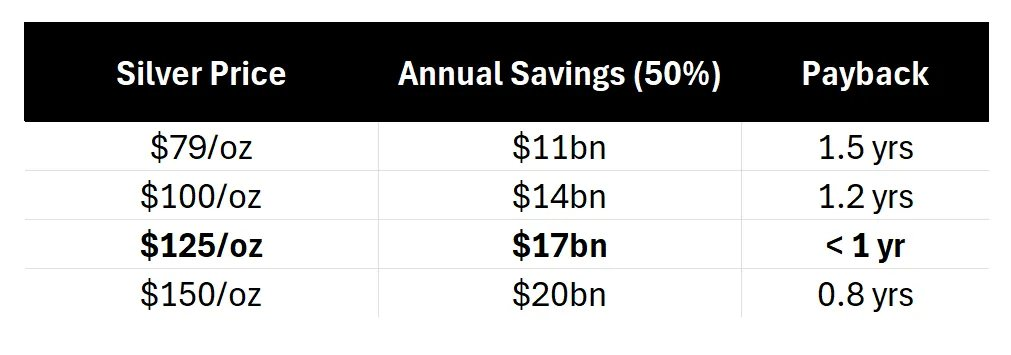 当白银价格达到 125 美元/盎司时,铜替代的回报周期将缩短至不到一年,到那时,每一次董事会会议都可能围绕铜替代展开讨论。然而,即使所有企业明天就做出决定,距离实现 50% 的铜替代仍需 4 年时间。同时,125 美元/盎司的价格比当前现货价格仍高出 50%。
