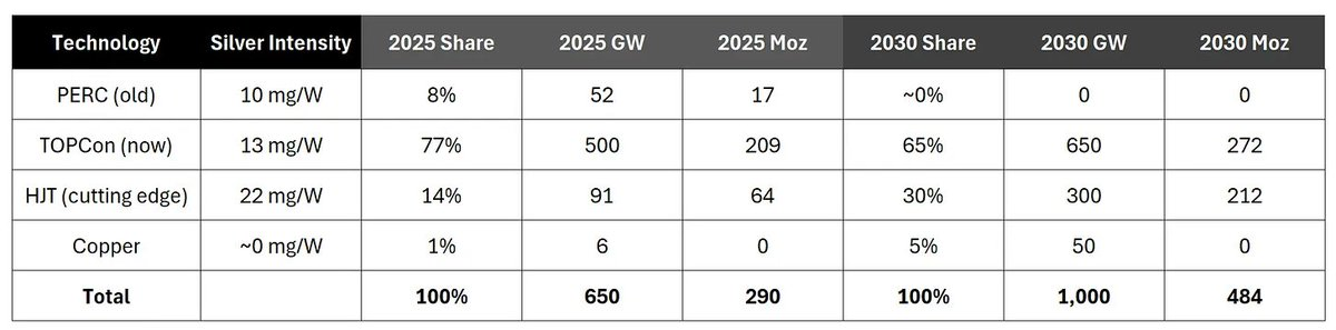从 PERC 到 TOPCon 再到 HJT(异质结)技术的转变,实际上增加了每瓦太阳能板的白银用量,即使铜在某些方面逐步取代白银。但需要注意的是,尽管每种技术的银用量效率会随着时间提高,但没有大规模的铜投资计划,行业整体上正朝着每瓦使用更多白银的方向发展,而不是更少。