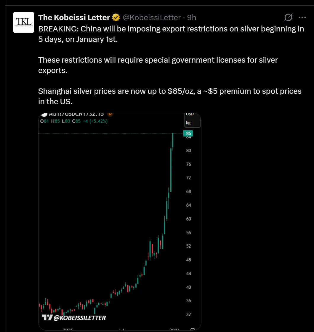 中国将在 5 天内实施白银出口限制;