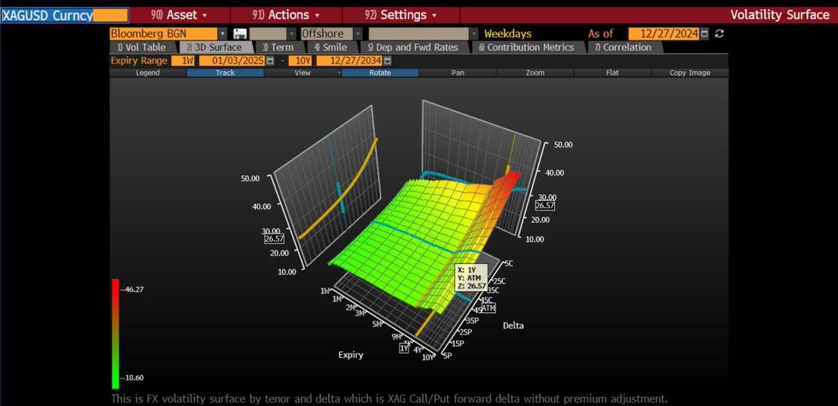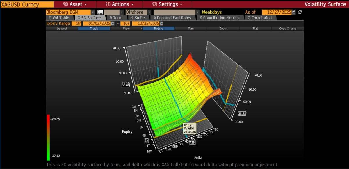 平值期权的隐含波动率(ATM Volatility)同比从 27% 上升到 43%。看涨期权的隐含波动率更为陡峭——价外(OTM)执行价的期权隐含波动率高达 50-70%。这表明期权市场正在为价格大幅上涨的尾部风险定价。