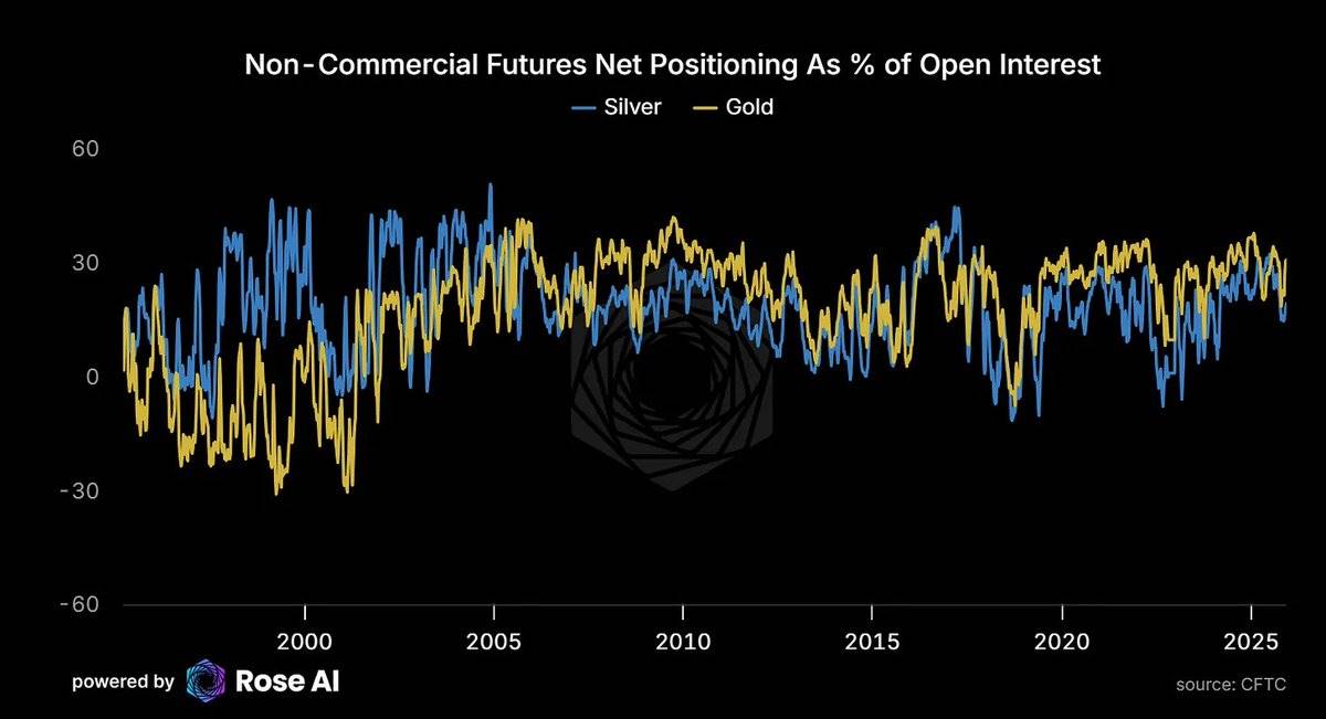 当前,黄金市场的投机净多头持仓占总未平仓合约(Open Interest)的 31%,而白银市场的这一比例仅为 19%。这表明,尽管白银价格已经上涨,但投机性头寸并未达到极端水平,仍有进一步上涨的空间。