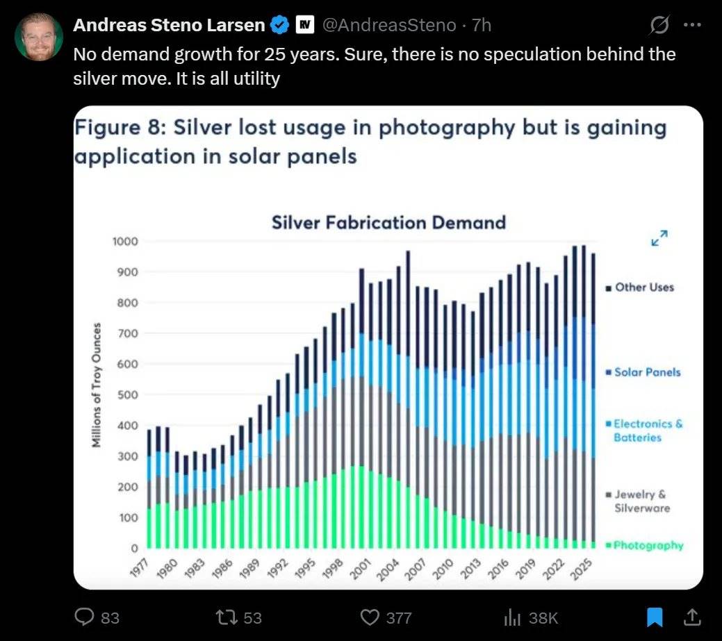 白银的投资逻辑根本不在于技术图表的“线条”或“茶叶占卜”。白银的核心驱动力在于其供需基本面:太阳能板的经济效益(需求缺乏弹性,白银成本仅占太阳能板价格的约 10%)与白银供应的刚性(75% 的白银是其他金属的副产品)之间的碰撞。这些才是真正推动短期价格波动的因素。