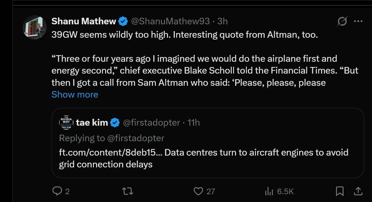 Sam Altman(OpenAI CEO)正在四处联系企业,急切地寻求电力供应;