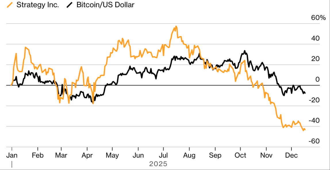 7 月,Strategy 股价创下纪录,年初至今涨幅达 57%;但随着「数字资产财库公司」数量激增、加密代币价格从高点回落,Strategy 及其「模仿者」的股价开始下跌,Strategy 相对于比特币的溢价也随之缩水 —— 查诺斯的押注开始见效。