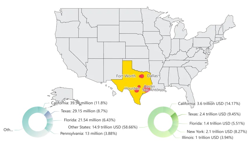 得州 2022 年的经济总量为 2.4 万亿美元,占美国 GDP 的 9.4%。其主要产业涵盖能源、农业、高科技制造和金融服务。自然资源十分丰富,石油、天然气是得州最主要矿产,已知石油储量超过 80 亿桶,约占美国已知供应量的 1/3。很多国际大型石油公司总部位于得州,包括埃克森美孚公司、BP。得州也是美国开发计算机组件和系统以及软件的主要枢纽之一。奥斯汀、达拉斯和休斯敦是得州该行业的主要中心,奥斯汀地区常被称为「硅山」。得州平均电价约为 10.50 分每千瓦时,产能全国占比 25.5%,是用电的自由之地。