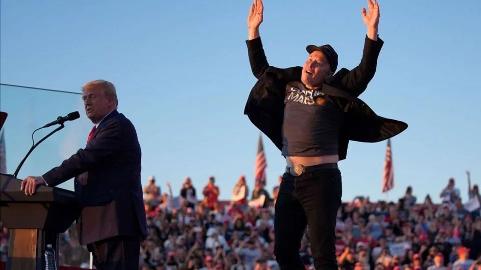 时间来到 10 月,特朗普重返宾夕法尼亚州巴特勒市并举行了竞选集会,马斯克受邀相随,头戴 MEGA,在台上露肉助阵,还发表了一段演讲赞扬特朗普的男子汉精神,一派两相繁荣之象。