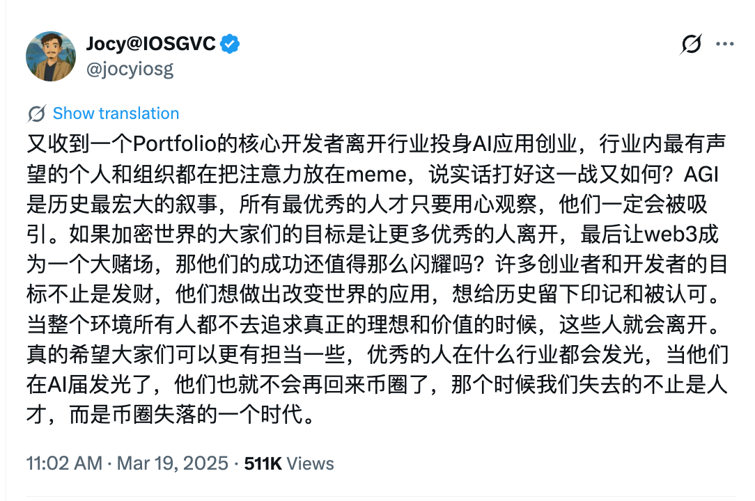 Last April, I tweeted about a portfolio company’s core team pivoting to AI application startups—a sign that even the industry’s most respected talent was leaving. Today, that trend has only accelerated. This isn’t coincidence; it reflects a deeper systemic issue: after making money, U.S. and Chinese crypto OGs chose radically different paths.