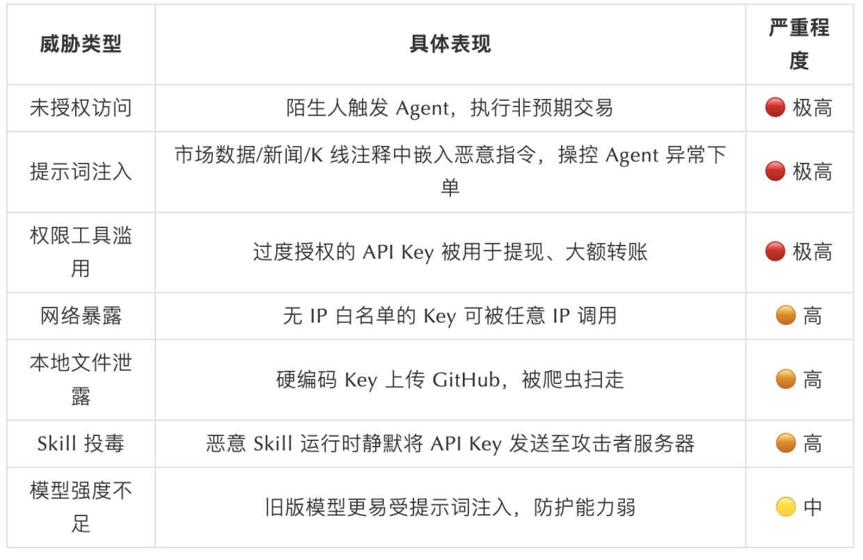 In conventional trading scenarios, security risks typically center on compromised account credentials, leaked API keys, or phishing attacks. In contrast, new risks are emerging within AI Agent architectures—for example, prompt injection attacks may manipulate an Agent’s decision logic; malicious plugins or Skills may serve as novel supply chain attack vectors; and misconfigured runtime environments may lead to unauthorized access to sensitive data or excessive API privileges. When such vulnerabilities intersect with automated trading systems, the potential impact extends beyond mere information leakage and may result in direct financial loss.
