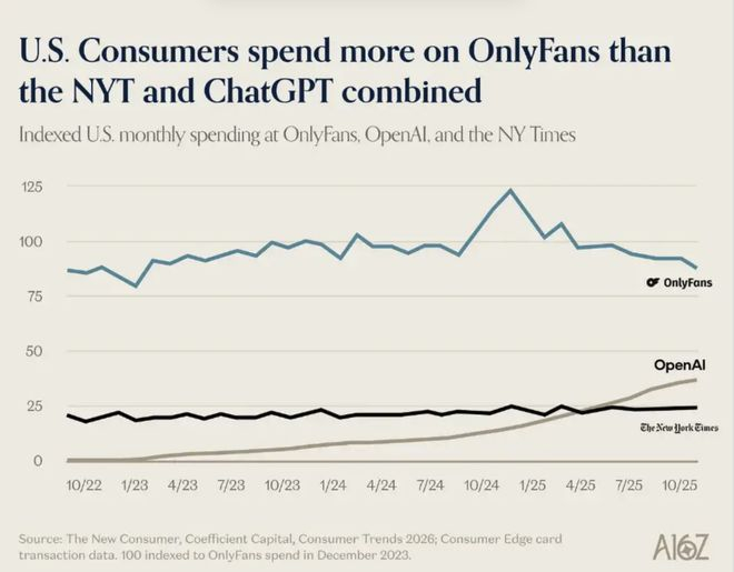 A16Z, a top-tier VC firm in Silicon Valley’s investment circle, recently published a report analyzing AI consumer trends. Buried within this otherwise serious discussion of AI productivity was a line chart that left readers both amused and dismayed: last year, U.S. users spent more money on OnlyFans than they did combined on OpenAI and The New York Times.