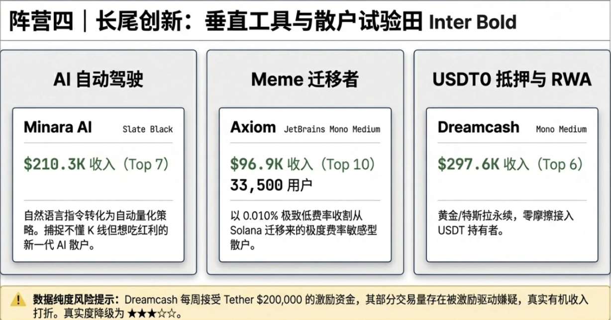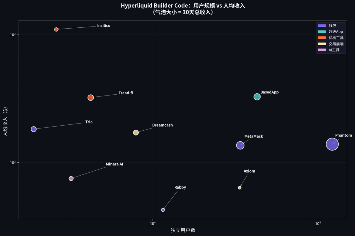 - Retail users (Phantom, Axiom, Rabby): Large user counts, low per-user contribution