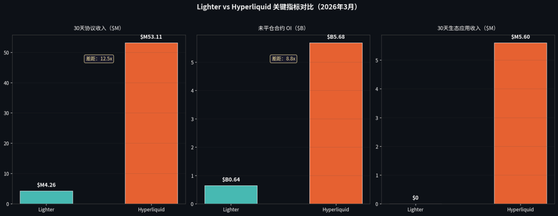 The gap between Lighter and Hyperliquid appears superficially as a revenue disparity (12.5×), but fundamentally reflects a difference in ecosystem development stage.