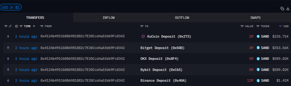 TechFlow news, January 2, according to Arkham monitoring data, in the past two hours, a total of 27 million SAND tokens were transferred from a newly created address three days ago to five CEXs including Binance, OKX, and Bitget, with a value of approximately $3 million. Tracking the transactions revealed that these tokens originated from The Sandbox team's Gnosis Safe Proxy address and were routed through an intermediate wallet previously associated with Animoca Brands to this wallet.
