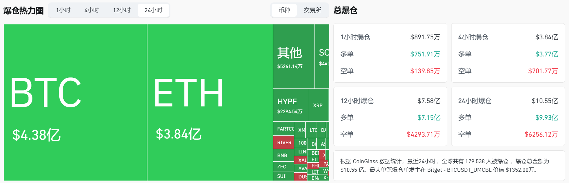 BTC liquidations amounted to $438 million, while ETH liquidations reached $384 million. A total of 179,538 people were liquidated within the past 24 hours, with the largest single liquidation valued at $13.52 million.