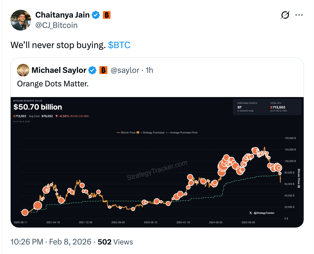 TechFlow News, February 8: Chaitanya Jain, Bitcoin Strategy Manager at Strategy, posted on social media, “We will never stop buying Bitcoin.”