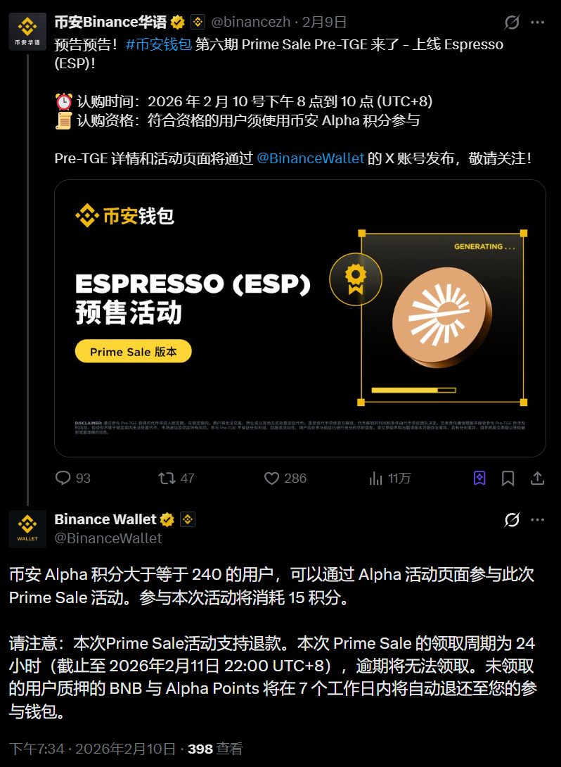 TechFlow News: On February 10, according to the official announcement, users with a Binance Alpha Score of 240 or higher may participate in this Prime Sale via the Alpha campaign page. Participation will consume 15 Alpha Points.