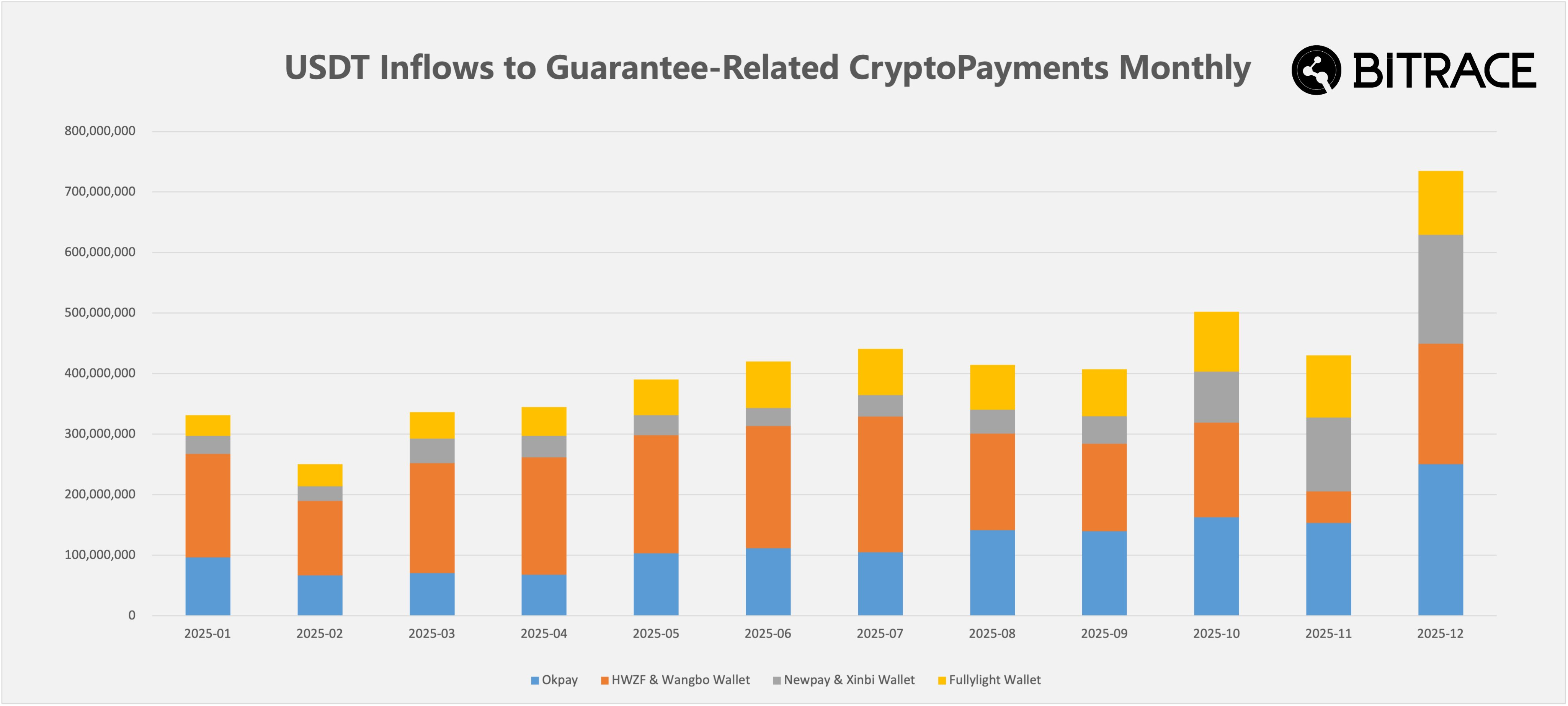 TechFlow News, February 10: According to on-chain monitoring by Bitrace (@Bitrace_team), Huionepay collected a total of $52.4 billion in USDT throughout 2025; however, its on-chain activity nearly ceased entirely by December. Following Huionepay’s collapse, its competitors—Okpay, Fullylight Wallet, and Newpay—saw increased transaction volumes in November and December, generating over $5 billion in total revenue for 2025. Yet this amount represents only a small fraction of the volume Huionepay once processed.