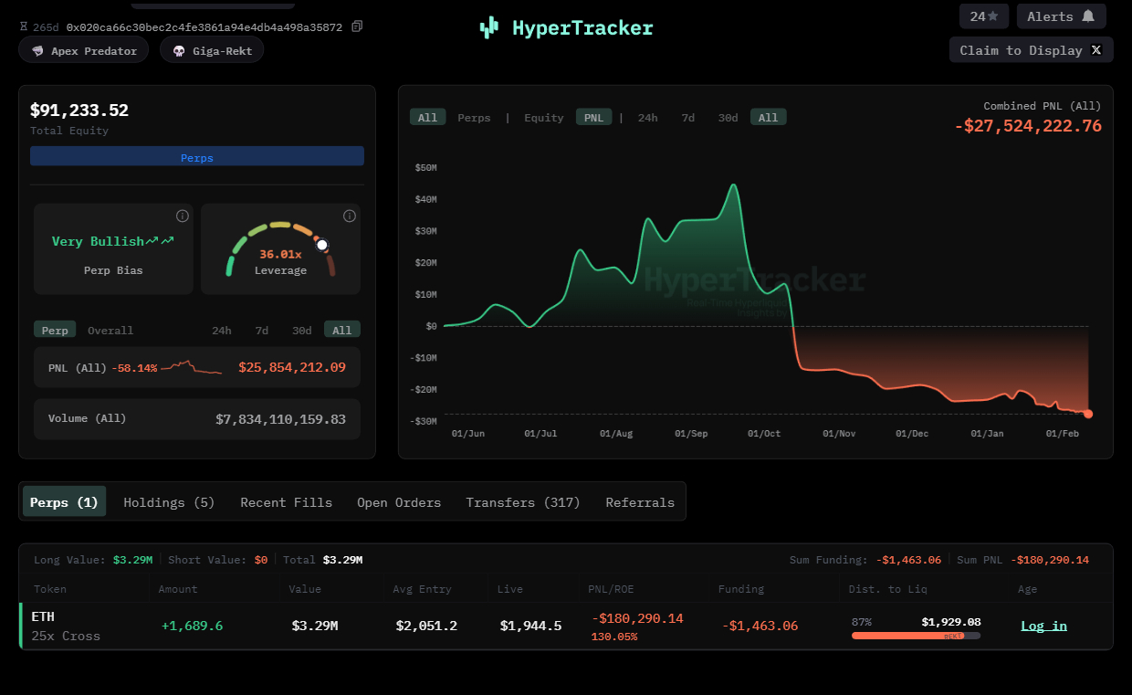 TechFlow News: On February 11, according to on-chain data analytics platform Onchain Lens (@OnchainLens), amid continued market downturns, “Brother Ma Ji” Huang Licheng’s 25x long ETH position was partially liquidated again, bringing his total losses to over $27.52 million.
