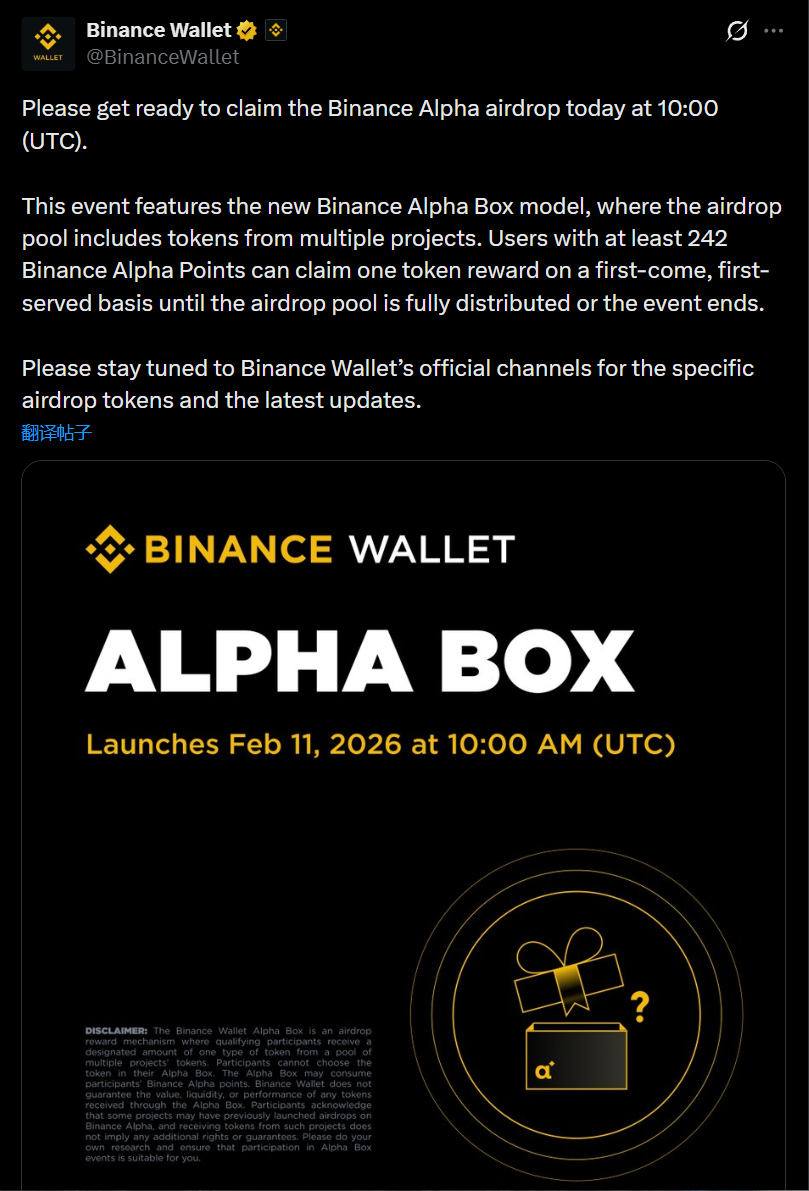 TechFlow reports that, according to the official announcement, eligible users can claim the Binance Alpha airdrop starting today at 18:00 (UTC+8) on February 11.