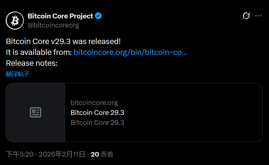 TechFlow reports that, according to an official announcement on February 11, Bitcoin Core v29.3 has been officially released; users may download it from the official website.
