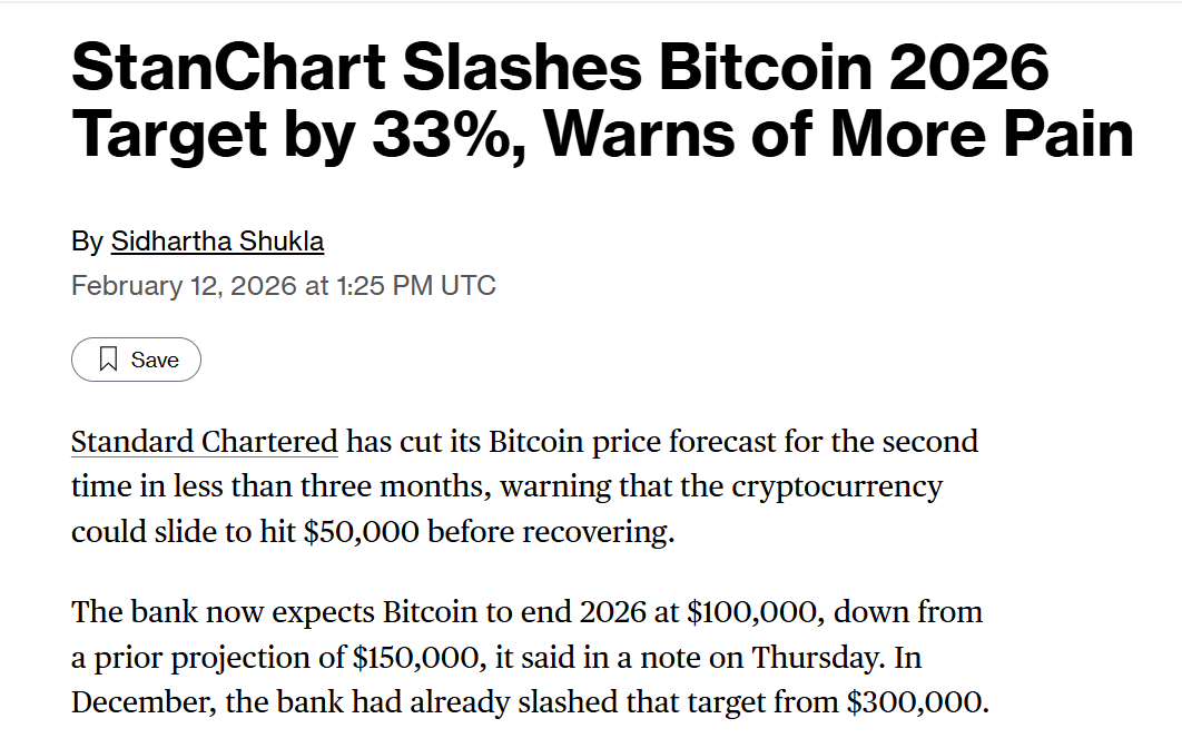 TechFlow News, February 12: According to Bloomberg, Standard Chartered Bank has downgraded its Bitcoin price forecast for the second consecutive time, lowering its year-end 2026 target price from $150,000 to $100,000—a 33% reduction. In a report released on Thursday, the bank warned that Bitcoin’s price could fall to $50,000 before rebounding.