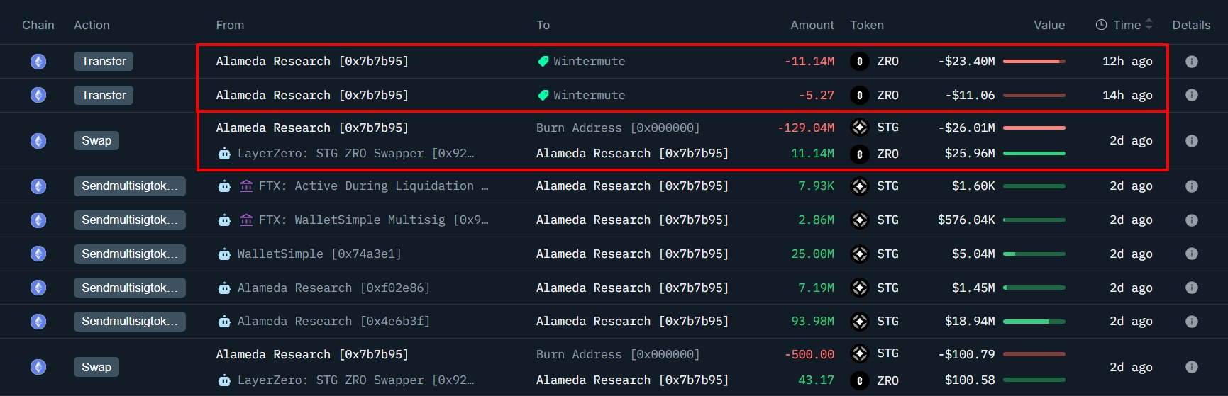 TechFlow News: On February 13, according to Onchain Lens (@OnchainLens), Alameda’s bankruptcy wallet swapped 129.04 million STG tokens (approximately $26 million) for 11.14 million ZRO tokens (approximately $25.96 million) yesterday.