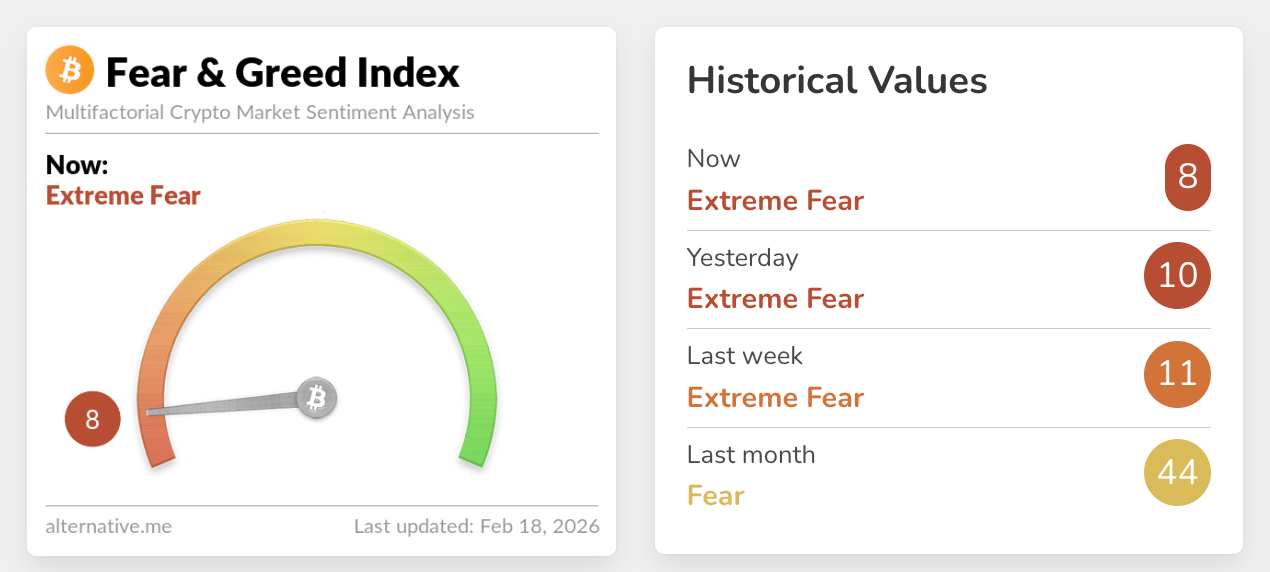 TechFlow News: On February 18, according to Alternative data, the Crypto Fear & Greed Index dropped to 8 today, down from 10 yesterday, indicating the market remains in a state of “extreme fear.”