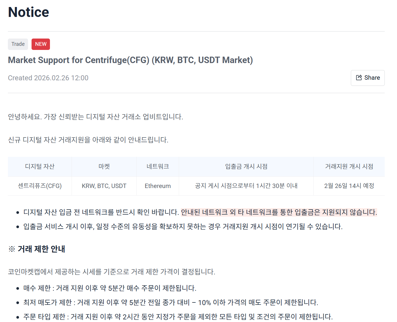 TechFlow reports that, according to an official announcement on February 26, Upbit will list CFG trading pairs against the South Korean won (KRW), Bitcoin (BTC), and Tether (USDT).