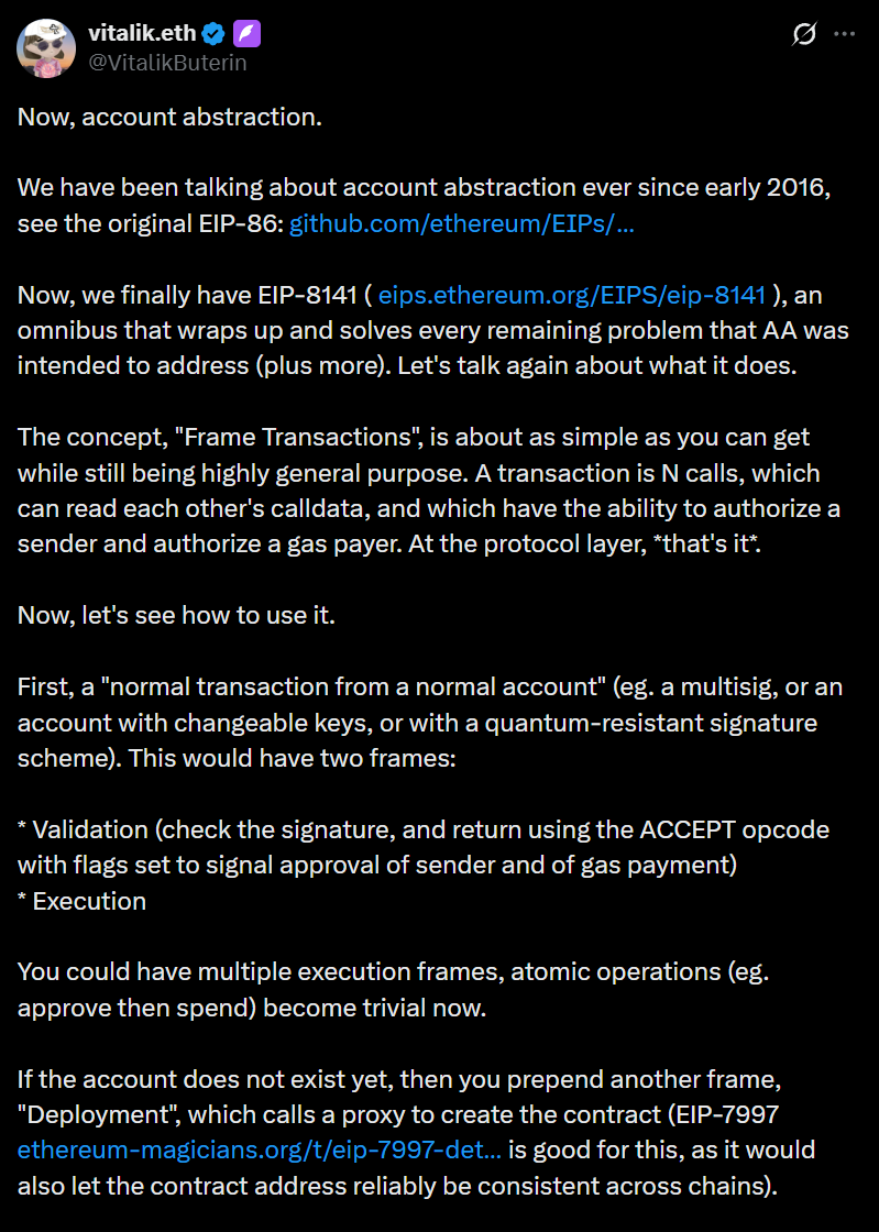 TechFlow News, February 28: Ethereum co-founder Vitalik Buterin posted on social media stating that Ethereum Improvement Proposal (EIP) 8141 will comprehensively address the Account Abstraction (AA) problem. This proposal introduces the concept of “framework transactions,” enabling a single transaction to contain multiple calls that can read each other’s calldata and authorize both the sender and the fee payer.