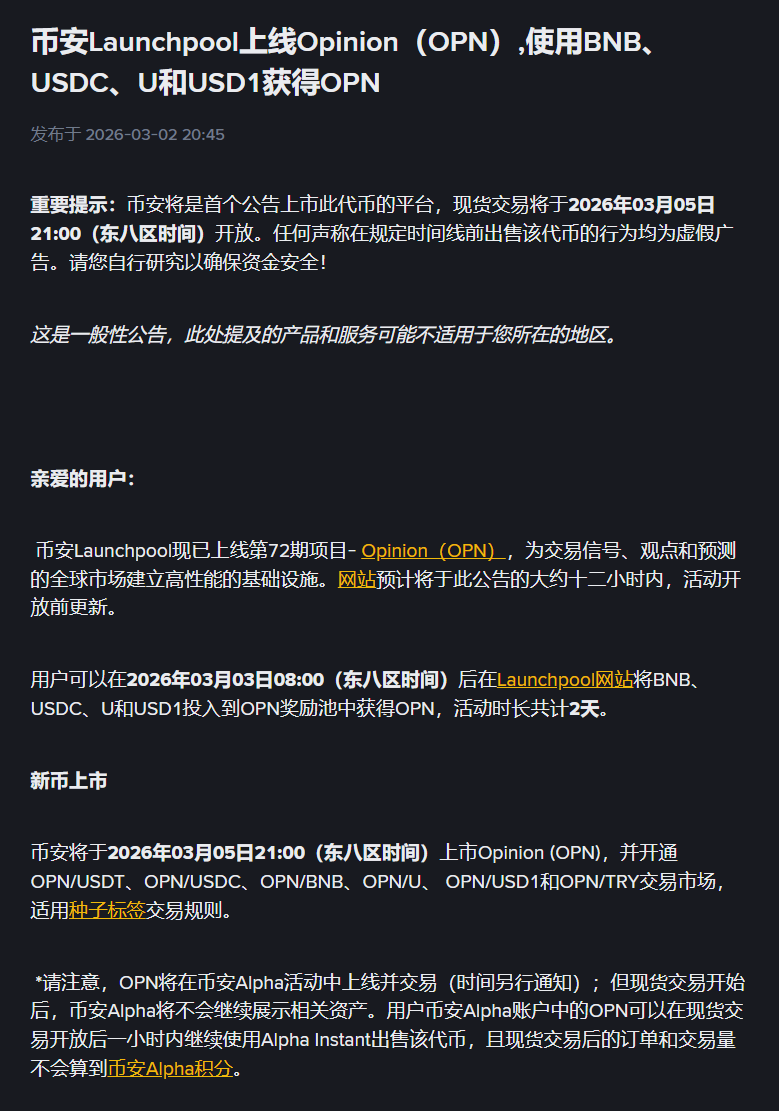 Binance will list Opinion (OPN) at 21:00 (UTC+8) on March 5, 2026, and open trading pairs OPN/USDT, OPN/USDC, OPN/BNB, OPN/U, OPN/USD1, and OPN/TRY, subject to the Seed Tag Trading Rules.